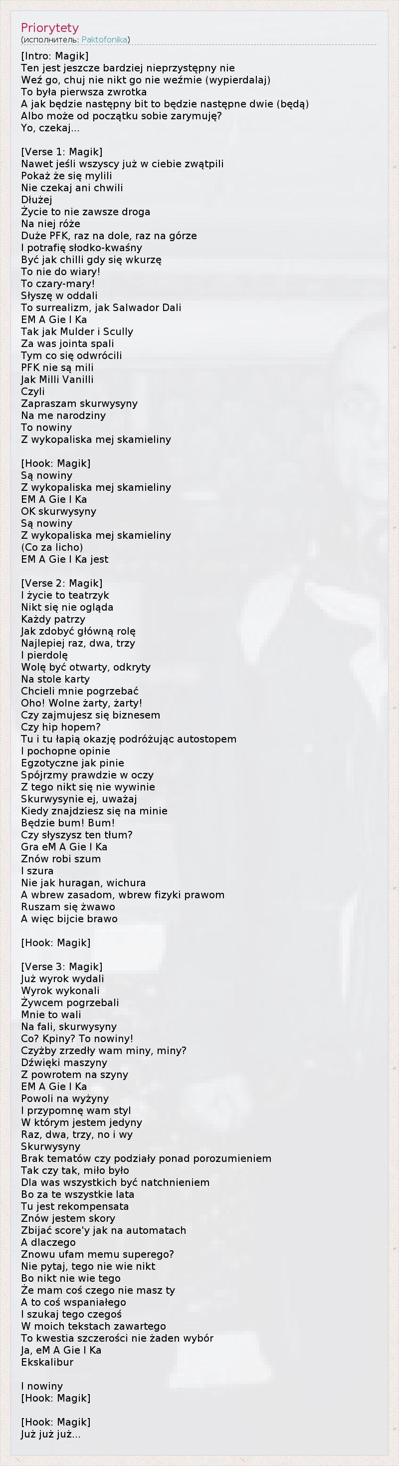 [Intro: Magik] Ten jest jeszcze bardziej nieprzystępny nie Weź go, chuj nie nikt go nie weźmie (wypierdalaj) To była pierwsza zwrotka A jak będzie następny bit to będzie następne dwie (będą) Albo może od początku sobie zarymuję? Yo, czekaj... [Verse 1: Magik] Nawet jeśli wszyscy już w ciebie zwątpili Pokaż że się mylili Nie czekaj ani chwili Dłużej Życie to nie zawsze droga Na niej róże Duże PFK, raz na dole, raz na górze I potrafię słodko-kwaśny Być jak chilli gdy się wkurzę To nie do wiary! To czary-mary! Słyszę w oddali To surrealizm, jak Salwador Dali EM A Gie I Ka Tak jak Mulder i Scully Za was jointa spali Tym co się odwrócili PFK nie są mili Jak Milli Vanilli Czyli Zapraszam skurwysyny Na me narodziny To nowiny Z wykopaliska mej skamieliny [Hook: Magik] Są nowiny Z wykopaliska mej skamieliny EM A Gie I Ka OK skurwysyny Są nowiny Z wykopaliska mej skamieliny (Co za licho) EM A Gie I Ka jest [Verse 2: Magik] I życie to teatrzyk Nikt się nie ogląda Każdy patrzy Jak zdobyć główną rolę Najlepiej raz, dwa, trzy I pierdolę Wolę być otwarty, odkryty Na stole karty Chcieli mnie pogrzebać Oho! Wolne żarty, żarty! Czy zajmujesz się biznesem Czy hip hopem? Tu i tu łapią okazję podróżując autostopem I pochopne opinie Egzotyczne jak pinie Spójrzmy prawdzie w oczy Z tego nikt się nie wywinie Skurwysynie ej, uważaj Kiedy znajdziesz się na minie Będzie bum! Bum! Czy słyszysz ten tłum? Gra eM A Gie I Ka Znów robi szum I szura Nie jak huragan, wichura A wbrew zasadom, wbrew fizyki prawom Ruszam się żwawo A więc bijcie brawo [Hook: Magik] [Verse 3: Magik] Już wyrok wydali Wyrok wykonali Żywcem pogrzebali Mnie to wali Na fali, skurwysyny Co? Kpiny? To nowiny! Czyżby zrzedły wam miny, miny? Dźwięki maszyny Z powrotem na szyny EM A Gie I Ka Powoli na wyżyny I przypomnę wam styl W którym jestem jedyny Raz, dwa, trzy, no i wy Skurwysyny Brak tematów czy podziały ponad porozumieniem Tak czy tak, miło było Dla was wszystkich być natchnieniem Bo za te wszystkie lata Tu jest rekompensata Znów jestem skory Zbijać score'y jak na automatach A dlaczego Znowu ufam memu superego? Nie pytaj, tego nie wie nikt Bo nikt nie wie tego Że mam coś czego nie masz ty A to coś wspaniałego I szukaj tego czegoś W moich tekstach zawartego To kwestia szczerości nie żaden wybór Ja, eM A Gie I Ka Ekskalibur I nowiny [Hook: Magik] [Hook: Magik] Już już już...