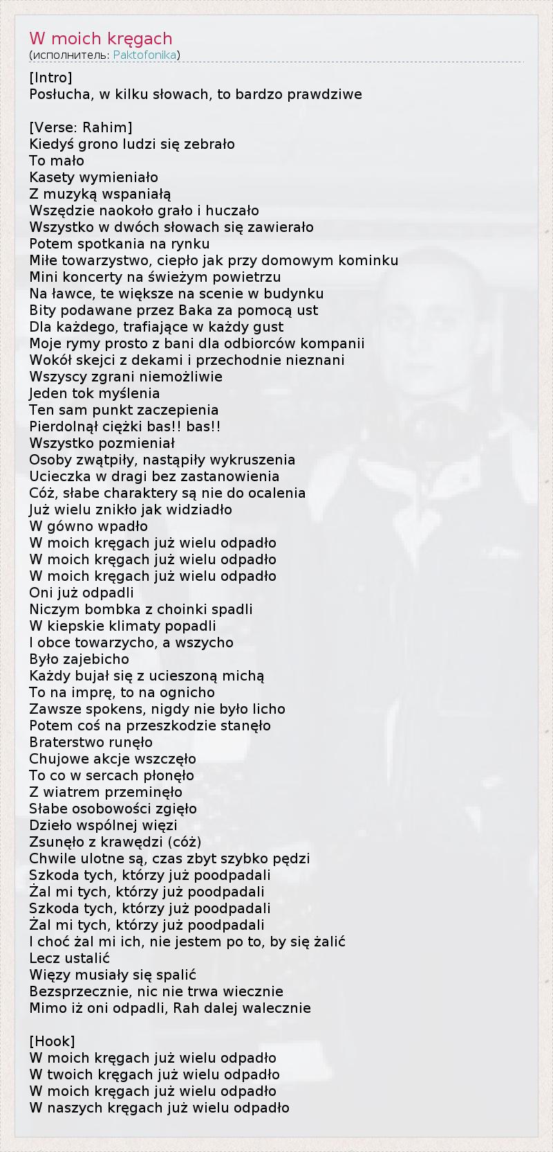[Intro] Posłucha, w kilku słowach, to bardzo prawdziwe [Verse: Rahim] Kiedyś grono ludzi się zebrało To mało Kasety wymieniało Z muzyką wspaniałą Wszędzie naokoło grało i huczało Wszystko w dwóch słowach się zawierało Potem spotkania na rynku Miłe towarzystwo, ciepło jak przy domowym kominku Mini koncerty na świeżym powietrzu Na ławce, te większe na scenie w budynku Bity podawane przez Baka za pomocą ust Dla każdego, trafiające w każdy gust Moje rymy prosto z bani dla odbiorców kompanii Wokół skejci z dekami i przechodnie nieznani Wszyscy zgrani niemożliwie Jeden tok myślenia Ten sam punkt zaczepienia Pierdolnął ciężki bas!! bas!! Wszystko pozmieniał Osoby zwątpiły, nastąpiły wykruszenia Ucieczka w dragi bez zastanowienia Cóż, słabe charaktery są nie do ocalenia Już wielu znikło jak widziadło W gówno wpadło W moich kręgach już wielu odpadło W moich kręgach już wielu odpadło W moich kręgach już wielu odpadło Oni już odpadli Niczym bombka z choinki spadli W kiepskie klimaty popadli I obce towarzycho, a wszycho Było zajebicho Każdy bujał się z ucieszoną michą To na imprę, to na ognicho Zawsze spokens, nigdy nie było licho Potem coś na przeszkodzie stanęło Braterstwo runęło Chujowe akcje wszczęło To co w sercach płonęło Z wiatrem przeminęło Słabe osobowości zgięło Dzieło wspólnej więzi Zsunęło z krawędzi (cóż) Chwile ulotne są, czas zbyt szybko pędzi Szkoda tych, którzy już poodpadali Żal mi tych, którzy już poodpadali Szkoda tych, którzy już poodpadali Żal mi tych, którzy już poodpadali I choć żal mi ich, nie jestem po to, by się żalić Lecz ustalić Więzy musiały się spalić Bezsprzecznie, nic nie trwa wiecznie Mimo iż oni odpadli, Rah dalej walecznie [Hook] W moich kręgach już wielu odpadło W twoich kręgach już wielu odpadło W moich kręgach już wielu odpadło W naszych kręgach już wielu odpadło