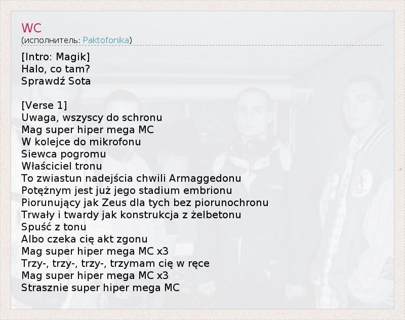 [Intro: Magik] Halo, co tam? Sprawdź Sota [Verse 1] Uwaga, wszyscy do schronu Mag super hiper mega MC W kolejce do mikrofonu Siewca pogromu Właściciel tronu To zwiastun nadejścia chwili Armaggedonu Potężnym jest już jego stadium embrionu Piorunujący jak Zeus dla tych bez piorunochronu Trwały i twardy jak konstrukcja z żelbetonu Spuść z tonu Albo czeka cię akt zgonu Mag super hiper mega MC x3 Trzy-, trzy-, trzy-, trzymam cię w ręce Mag super hiper mega MC x3 Strasznie super hiper mega MC