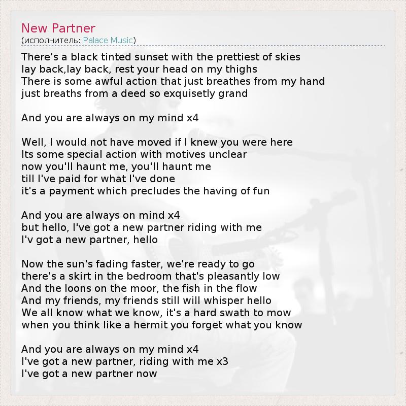 There's a black tinted sunset with the prettiest of skies lay back,lay back, rest your head on my thighs There is some awful action that just breathes from my hand just breaths from a deed so exquisetly grand And you are always on my mind x4 Well, I would not have moved if I knew you were here Its some special action with motives unclear now you'll haunt me, you'll haunt me till I've paid for what I've done it's a payment which precludes the having of fun And you are always on mind x4 but hello, I've got a new partner riding with me I'v got a new partner, hello Now the sun's fading faster, we're ready to go there's a skirt in the bedroom that's pleasantly low And the loons on the moor, the fish in the flow And my friends, my friends still will whisper hello We all know what we know, it's a hard swath to mow when you think like a hermit you forget what you know And you are always on my mind x4 I've got a new partner, riding with me x3 I've got a new partner now