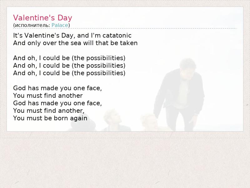 It's Valentine's Day, and I'm catatonic And only over the sea will that be taken And oh, I could be (the possibilities) And oh, I could be (the possibilities) And oh, I could be (the possibilities) God has made you one face, You must find another God has made you one face, You must find another, You must be born again