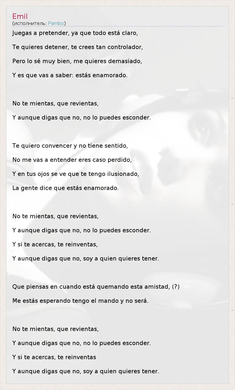 Juegas a pretender, ya que todo está claro, Te quieres detener, te crees tan controlador, Pero lo sé muy bien, me quieres demasiado, Y es que vas a saber: estás enamorado. No te mientas, que revientas, Y aunque digas que no, no lo puedes esconder. Te quiero convencer y no tiene sentido, No me vas a entender eres caso perdido, Y en tus ojos se ve que te tengo ilusionado, La gente dice que estás enamorado. No te mientas, que revientas, Y aunque digas que no, no lo puedes esconder. Y si te acercas, te reinventas, Y aunque digas que no, soy a quien quieres tener. Que piensas en cuando está quemando esta amistad, (?) Me estás esperando tengo el mando y no será. No te mientas, que revientas, Y aunque digas que no, no lo puedes esconder. Y si te acercas, te reinventas Y aunque digas que no, soy a quien quieres tener.