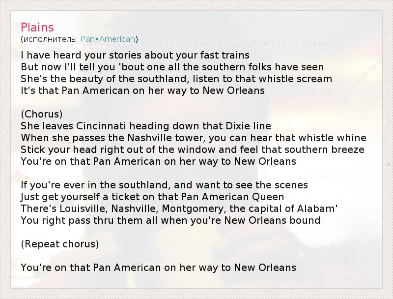 I have heard your stories about your fast trains But now I'll tell you 'bout one all the southern folks have seen She's the beauty of the southland, listen to that whistle scream It's that Pan American on her way to New Orleans (Chorus) She leaves Cincinnati heading down that Dixie line When she passes the Nashville tower, you can hear that whistle whine Stick your head right out of the window and feel that southern breeze You're on that Pan American on her way to New Orleans If you're ever in the southland, and want to see the scenes Just get yourself a ticket on that Pan American Queen There's Louisville, Nashville, Montgomery, the capital of Alabam' You right pass thru them all when you're New Orleans bound (Repeat chorus) You're on that Pan American on her way to New Orleans