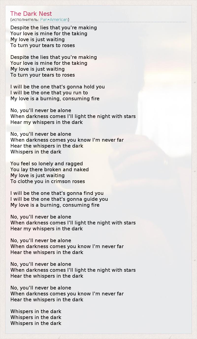 Несмотря на ложь, что ты говоришь, Твоё сердце принадлежит мне. Моя любовь лишь ждет, Чтобы превратить твои слезы в лепестки роз. Несмотря на ложь, что ты говоришь, Твоё сердце принадлежит мне. Моя любовь только и ждёт, Чтобы превратить твои слёзы в лепестки роз. Я буду тем, кто обнимет тебя, Я буду тем, к кому ты побежишь. Моя любовь – пылающий, сжигающий огонь. Нет, ты больше не будешь одна! Когда наступит ночь, я зажгу звёзды в небесах. Только услышь мой шёпот во тьме... Нет, ты больше не будешь одна! Когда наступает ночь, ты же знаешь, что я всегда рядом. Только услышь мой шёпот во тьме, Шёпот во тьме. Ты чувствуешь себя одинокой и разбитой. Ты лежала там, сокрушённая и беззащитная... Моя любовь только и ждёт, Чтобы облачить тебя в алые розы. Я буду тем, кто найдет тебя, Я буду тем, кто поведёт тебя за собой. Моя любовь – пылающий, сжигающий огонь... Нет, ты больше не будешь одна! Когда наступит ночь, я зажгу звёзды в небесах. Только услышь мой шёпот во тьме... Нет, ты больше не будешь одна! Когда наступает ночь, ты же знаешь, что я всегда рядом. Только услышь мой шёпот во тьме, Шёпот во тьме. Когда наступит ночь, я буду зажигать звезды в небесах Лишь услышь мой шепот во тьме Нет, ты больше не будешь одна! Когда наступает ночь, ты же знаешь, что я всегда рядом. Только услышь мой шёпот во тьме. Шёпот во тьме, Шёпот во тьме, Шёпот во тьме...