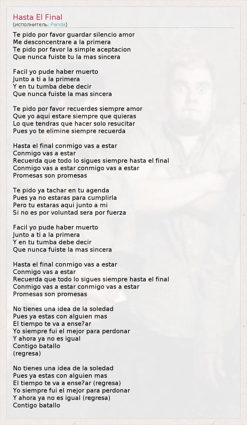 Te pido por favor guardar silencio amor Me desconcentrare a la primera Te pido por favor la simple aceptacion Que nunca fuiste tu la mas sincera Facil yo pude haber muerto Junto a ti a la primera Y en tu tumba debe decir Que nunca fuiste la mas sincera Te pido por favor recuerdes siempre amor Que yo aqui estare siempre que quieras Lo que tendras que hacer solo resucitar Pues yo te elimine siempre recuerda Hasta el final conmigo vas a estar Conmigo vas a estar Recuerda que todo lo sigues siempre hasta el final Conmigo vas a estar conmigo vas a estar Promesas son promesas Te pido ya tachar en tu agenda Pues ya no estaras para cumplirla Pero tu estaras aqui junto a mi Si no es por voluntad sera por fuerza Facil yo pude haber muerto Junto a ti a la primera Y en tu tumba debe decir Que nunca fuiste la mas sincera Hasta el final conmigo vas a estar Conmigo vas a estar Recuerda que todo lo sigues siempre hasta el final Conmigo vas a estar conmigo vas a estar Promesas son promesas No tienes una idea de la soledad Pues ya estas con alguien mas El tiempo te va a ense?ar Yo siempre fui el mejor para perdonar Y ahora ya no es igual Contigo batallo (regresa) No tienes una idea de la soledad Pues ya estas con alguien mas El tiempo te va a ense?ar (regresa) Yo siempre fui el mejor para perdonar Y ahora ya no es igual (regresa) Contigo batallo