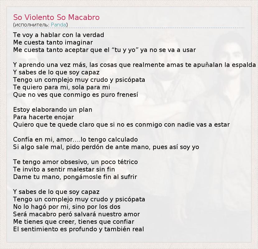 Te voy a hablar con la verdad Me cuesta tanto imaginar Me cuesta tanto aceptar que el “tu y yo” ya no se va a usar Y aprendo una vez más, las cosas que realmente amas te apuñalan la espalda Y sabes de lo que soy capaz Tengo un complejo muy crudo y psicópata Te quiero para mi, sola para mi Que no ves que conmigo es puro frenesí Estoy elaborando un plan Para hacerte enojar Quiero que te quede claro que si no es conmigo con nadie vas a estar Confía en mi, amor….lo tengo calculado Si algo sale mal, pido perdón de ante mano, pues así soy yo Te tengo amor obsesivo, un poco tétrico Te invito a sentir malestar sin fin Dame tu mano, pongámosle fin al sufrir Y sabes de lo que soy capaz Tengo un complejo muy crudo y psicópata No lo hagó por mi, sino por los dos Será macabro peró salvará nuestro amor Me tienes que creer, tienes que confiar El sentimiento es profundo y también real