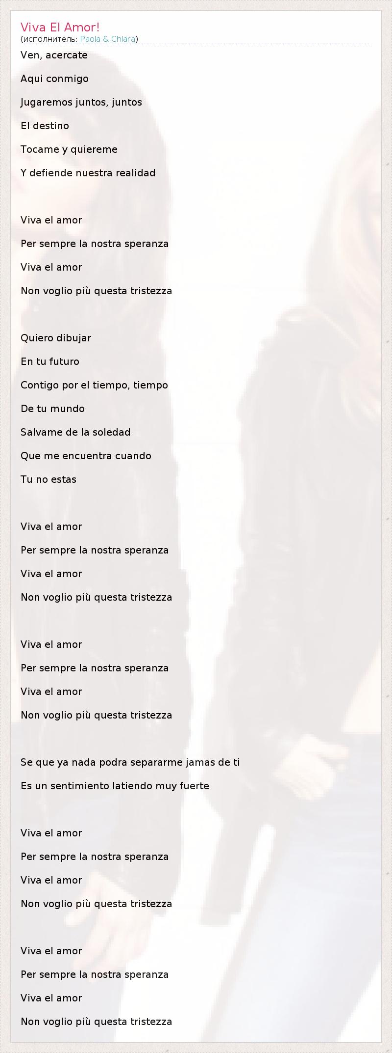 Ven, acercate Aqui conmigo Jugaremos juntos, juntos El destino Tocame y quiereme Y defiende nuestra realidad Viva el amor Per sempre la nostra speranza Viva el amor Non voglio più questa tristezza Quiero dibujar En tu futuro Contigo por el tiempo, tiempo De tu mundo Salvame de la soledad Que me encuentra cuando Tu no estas Viva el amor Per sempre la nostra speranza Viva el amor Non voglio più questa tristezza Viva el amor Per sempre la nostra speranza Viva el amor Non voglio più questa tristezza Se que ya nada podra separarme jamas de ti Es un sentimiento latiendo muy fuerte Viva el amor Per sempre la nostra speranza Viva el amor Non voglio più questa tristezza Viva el amor Per sempre la nostra speranza Viva el amor Non voglio più questa tristezza