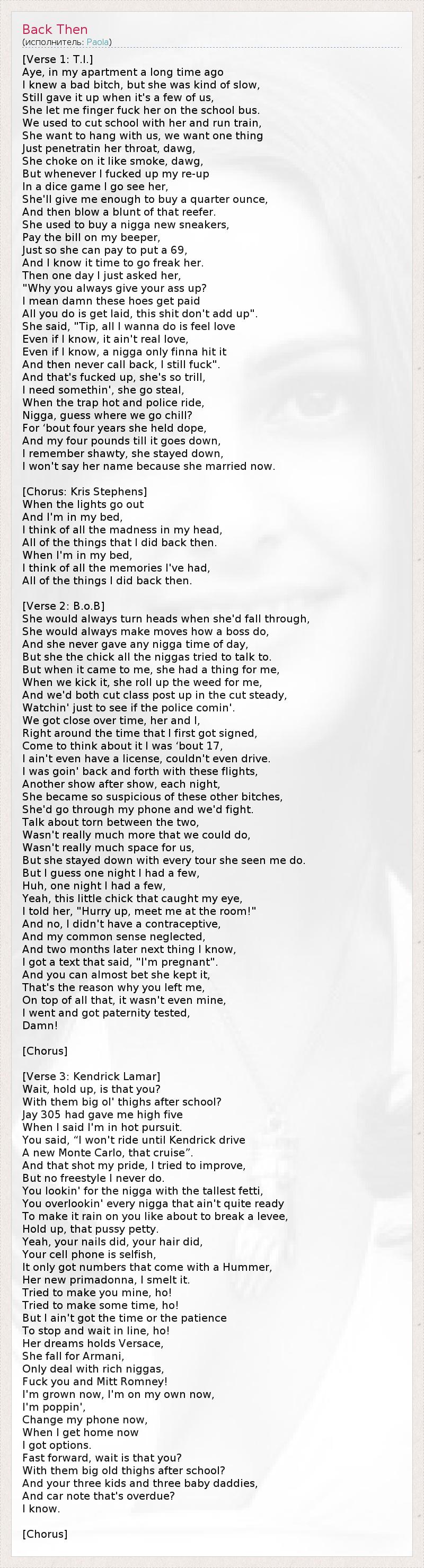 [Куплет 1: T.I.] Да, давным-давно у себя на хате, Я встречался с одной потаскушкой, она была маленько тормозной, Зато давала мне, когда никого не было поблизости, Разрешала засовывать в себя пальчик в школьном автобусе. Обычно мы т**хались за школой, причём, я был с друганами, Она хотела тусоваться с нами, а мы хотели одного – Чтобы она взяла в глотку, чел, От этого она задыхалась, как от затяжки, чел, Но если я про**ывал бабки на новый товар В кости, то обращался именно к ней, Она давала мне деньжат на восемь граммов И косячок с неплохой дурью. Она покупала мне новые кроссы, Оплачивала счёт за мобилу, Чтобы можно было скинуть мне: "69", 1 И я знал, что пора позабавиться с ней. Однажды я спросил её: "Почему ты сама раздвигаешь ноги? Блин, бл**ям и то платят, Тебе надо только лечь и расслабиться, больше ничего". Она ответила: "Тип, я лишь хочу ощущать себя любимой, Даже если знаю, что это неправда, Даже если знаю, что ниггер просто хочет засадить мне И больше не перезванивать, я всё равно буду с ним тр**аться". Ни х** себе, она здравая тёлка, Если мне что-то было нужно, она крала это для меня, А когда случались облавы и рейды, Ниггер, угадай, где мы хоронились? Она ныкала у себя дурь года четыре, Там были и мои кило восемьсот, но потом я их продал, Я помню эту девушку, она и сейчас живёт там же, Я не буду называть её имени, потому что она замужем. [Припев: Kris Stephens] Когда гаснет свет И я лежу у себя в постели, Я прокручиваю в голове все безумные картины Того, что я делала тогда. Когда я лежу в постели, Я прокручиваю воспоминания, Обо всём, что я делала раньше. [Куплет 2: B.o.B] Когда она проходила мимо, все заглядывались на неё, Она всегда делала всё, как серьёзная штучка, Она никогда даже не здоровалась с черномазыми, Но была из тех, с которыми все ниггеры хотят познакомиться. Когда она приходила ко мне, то у неё всегда было кое-что для меня, А после она заворачивала мне косяк, Мы вместе прогуливали уроки и прятались в надёжном месте, Чтобы видеть, не едет ли полиция. Мы всё больше сближались, она и я, Это было как раз тогда, когда я заключил свой первый контракт, Представьте себе: мне было лет семнадцать, У меня даже прав не было, я водить не умел., Я перелетал из одного города в другой, Концерт за концертом – и так каждую ночь, Она начала подозревать, что я сплю с другими тёлками, Она залезала в мой телефон, и из-за этого мы ругались. Я говорил, что буквально разрываюсь надвое, Мы мало что могли изменить, У нас не хватало времени на отношения, Она ездила со мной в каждое турне и смотрела, как я выступаю. Но однажды ночью я чуток перебрал, Ха, однажды ночью я чуток перебрал, Я перемигивался с одной цыпочкой, А потом сказал ей: "Давай по-быстрому у меня в номере!" И да, у нас не было средств защиты, Здравый смысл покинул меня, И что происходит через два месяца: Приходит смс: "Я беременна". Спорю на что угодно, аборт она не сделала, Вот почему ты бросила меня, В довершение всего, ребёнок был даже не мой, Я сдавал тест на отцовство. Чёрт! [Припев] [Куплет 3: Kendrick Lamar] Стой, погоди, это ты? Это у тебя после школы такие выросли? Джей 305 дал мне "пять", Когда узнал, что за мной гнались легавые. Ты сказала, что не будешь кататься с Кендриком, пока у него не будет Как минимум новой "Монте-Карло". 2 Это был удар по моему самолюбию, я решил стать круче, Но тогда я ещё не фристайлил. Ты искала ниггера с самым глубоким кошельком, И даже не с
