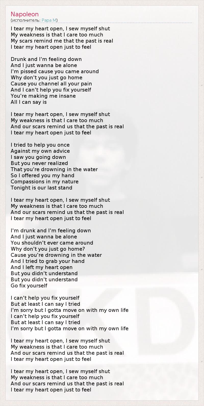 Я раскрываю своё сердце, я замыкаюсь в себе. Моя слабость в том, что мои чувства слишком сильны. Шрамы напоминают мне о том, что прошлое – это правда. Я раскрываю сердце для того, чтобы просто почувствовать… Пьяный и подавленный. Я просто хочу остаться один. Я напился из-за того, что ты пришла ко мне. Почему бы тебе просто не пойти домой? Ты изливаешь все свои переживания на меня, А я не могу помочь тебе оправиться от твоих потрясений. Ты сводишь меня с ума. Всё, что я могу сказать, - следующее… Я раскрываю своё сердце, я замыкаюсь в себе. Моя слабость в том, что мои чувства слишком сильны. Шрамы напоминают мне о том, что прошлое – это правда. Я раскрываю сердце для того, чтобы просто почувствовать… Однажды я пытался тебе помочь, Вопреки своему внутреннему импульсу. Я видел, как ты опускалась, Но ты не понимала, Что тонешь в воде, Поэтому я протянул тебе руку, Ведь по своей природе я способен на сострадание. Сегодня наша последняя встреча. Я раскрываю своё сердце, я замыкаюсь в себе. Моя слабость в том, что мои чувства слишком сильны. Шрамы напоминают мне о том, что прошлое – это правда. Я раскрываю сердце для того, чтобы просто почувствовать… Я пьяный и подавленный. Я просто хочу остаться один. Тебе не следовало приходить ко мне. Почему бы тебе просто не пойти домой? Ты тонешь в воде. Я уже пытался поймать твою руку И раскрыл своё сердце, Но ты не поняла, Но ты не поняла. Поэтому помогай себе сама. Я не могу помочь тебе вновь встать на ноги, Но, по крайней мере, я могу сказать, что я пытался. Извиняюсь, но я должен продолжать жить дальше. Я не могу помочь тебе вновь встать на ноги, Но, по крайней мере, я могу сказать, что я пытался. Извиняюсь, но я должен продолжать жить дальше. Я раскрываю своё сердце, я замыкаюсь в себе. Моя слабость в том, что мои чувства слишком сильны. Шрамы напоминают мне о том, что прошлое – это правда. Я раскрываю сердце для того, чтобы просто почувствовать… Я раскрываю своё сердце, я замыкаюсь в себе. Моя слабость в том, что мои чувства слишком сильны. Шрамы напоминают мне о том, что прошлое – это правда. Я раскрываю сердце для того, чтобы просто почувствовать…
