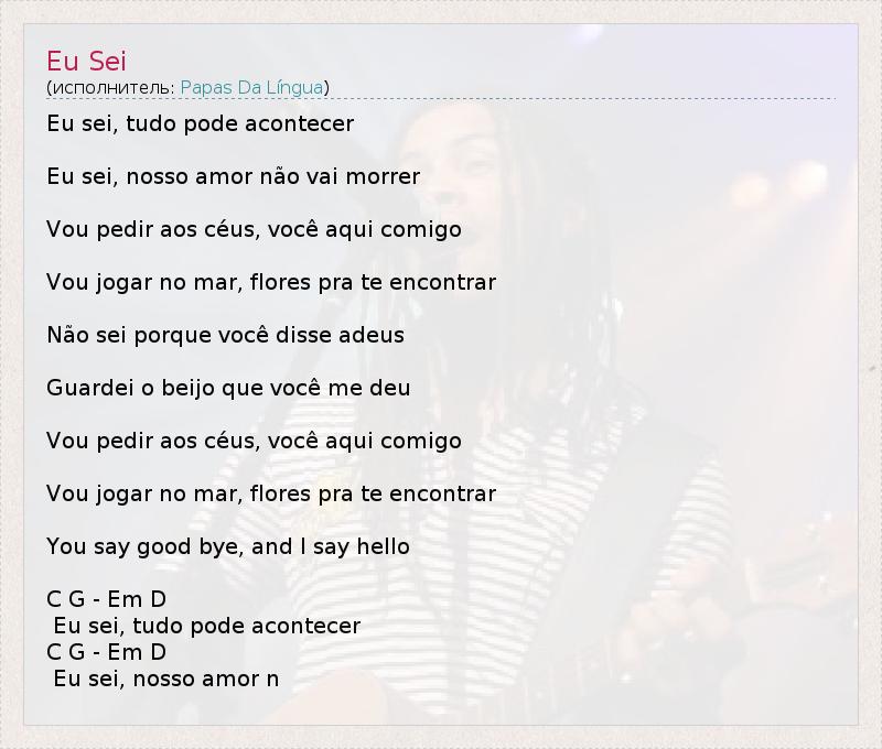 Eu сеи , Тудо Поде acontecer Eu сеи , Nosso Amor não вай morrer Vou pedir AOS CEUs , você Aqui Comigo Vou jogar не Mar , Флорес пра те encontrar Não сеи Porque você Диссе Adeus Guardei о Beijo Que você мне DEU Vou pedir AOS CEUs , você Aqui Comigo Vou jogar не Mar , Флорес пра те encontrar Вы говорите, до свидания , и я говорю привет C G - Em D Eu сеи , Тудо Поде acontecer C G - Em D Eu сеи , Nosso Amor н