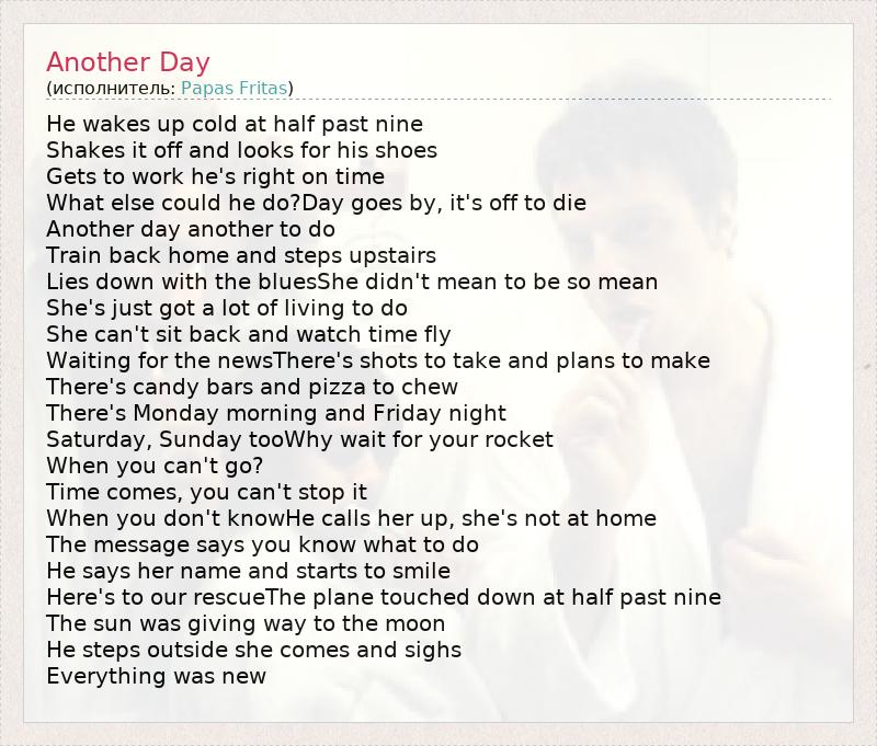 He wakes up cold at half past nine Shakes it off and looks for his shoes Gets to work he's right on time What else could he do?Day goes by, it's off to die Another day another to do Train back home and steps upstairs Lies down with the bluesShe didn't mean to be so mean She's just got a lot of living to do She can't sit back and watch time fly Waiting for the newsThere's shots to take and plans to make There's candy bars and pizza to chew There's Monday morning and Friday night Saturday, Sunday tooWhy wait for your rocket When you can't go? Time comes, you can't stop it When you don't knowHe calls her up, she's not at home The message says you know what to do He says her name and starts to smile Here's to our rescueThe plane touched down at half past nine The sun was giving way to the moon He steps outside she comes and sighs Everything was new