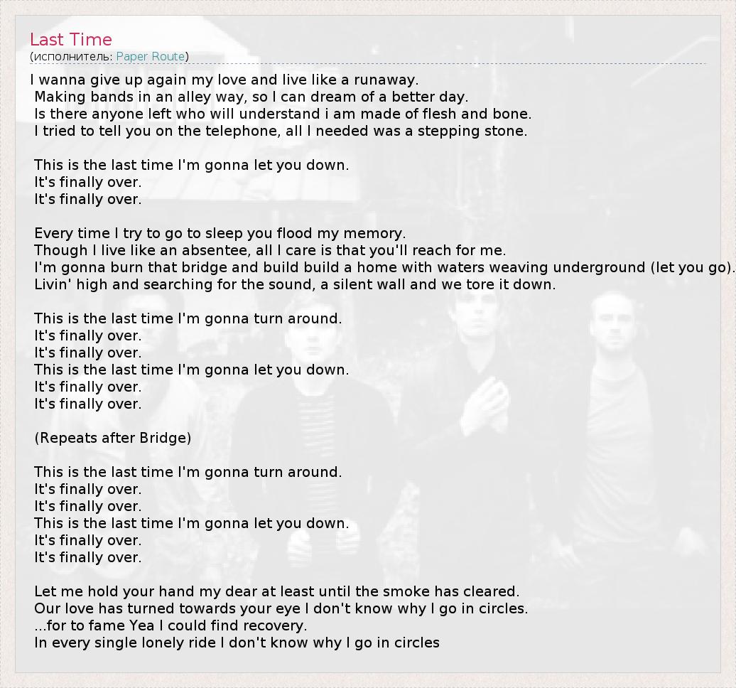 I wanna give up again my love and live like a runaway. Making bands in an alley way, so I can dream of a better day. Is there anyone left who will understand i am made of flesh and bone. I tried to tell you on the telephone, all I needed was a stepping stone. This is the last time I'm gonna let you down. It's finally over. It's finally over. Every time I try to go to sleep you flood my memory. Though I live like an absentee, all I care is that you'll reach for me. I'm gonna burn that bridge and build build a home with waters weaving underground (let you go). Livin' high and searching for the sound, a silent wall and we tore it down. This is the last time I'm gonna turn around. It's finally over. It's finally over. This is the last time I'm gonna let you down. It's finally over. It's finally over. (Repeats after Bridge) This is the last time I'm gonna turn around. It's finally over. It's finally over. This is the last time I'm gonna let you down. It's finally over. It's finally over. Let me hold your hand my dear at least until the smoke has cleared. Our love has turned towards your eye I don't know why I go in circles. ...for to fame Yea I could find recovery. In every single lonely ride I don't know why I go in circles