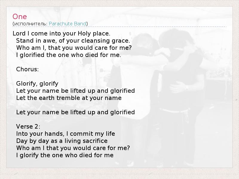 Lord I come into your Holy place. Stand in awe, of your cleansing grace. Who am I, that you would care for me? I glorified the one who died for me. Chorus: Glorify, glorify Let your name be lifted up and glorified Let the earth tremble at your name Let your name be lifted up and glorified Verse 2: Into your hands, I commit my life Day by day as a living sacrifice Who am I that you would care for me? I glorify the one who died for me
