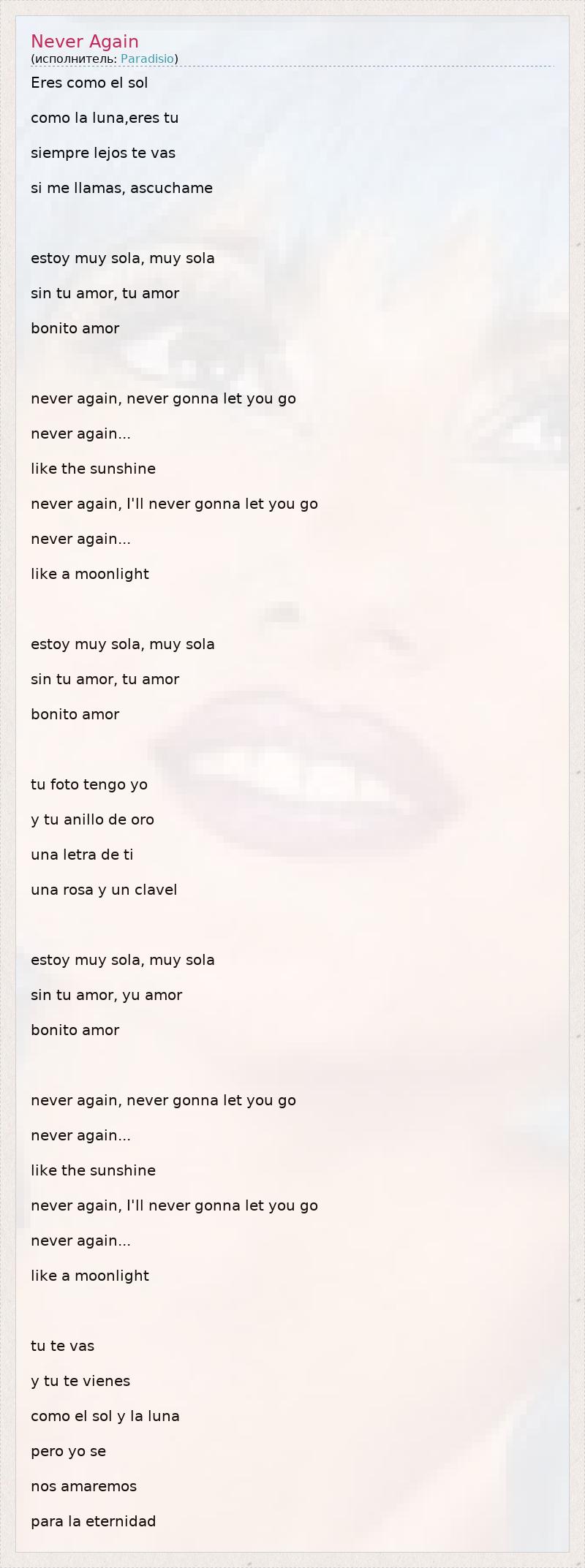 Eres como el sol como la luna,eres tu siempre lejos te vas si me llamas, ascuchame estoy muy sola, muy sola sin tu amor, tu amor bonito amor never again, never gonna let you go never again... like the sunshine never again, I'll never gonna let you go never again... like a moonlight estoy muy sola, muy sola sin tu amor, tu amor bonito amor tu foto tengo yo y tu anillo de oro una letra de ti una rosa y un clavel estoy muy sola, muy sola sin tu amor, yu amor bonito amor never again, never gonna let you go never again... like the sunshine never again, I'll never gonna let you go never again... like a moonlight tu te vas y tu te vienes como el sol y la luna pero yo se nos amaremos para la eternidad