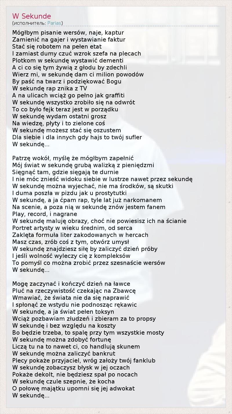 Mógłbym pisanie wersów, naje, kaptur Zamienić na gajer i wystawianie faktur Stać się robotem na pełen etat I zamiast dumy czuć wzrok szefa na plecach Plotkom w sekundę wystawić dementi A ci co się tym żywią z głodu by zdechli Wierz mi, w sekundę dam ci milion powodów By paść na twarz i podziękować Bogu W sekundę rap znika z TV A na ulicach wciąż go pełno jak graffiti W sekundę wszystko zrobiło się na odwrót To co było fejk teraz jest w porządku W sekundę wydam ostatni grosz Na wiedzę, płyty i to zielone coś W sekundę możesz stać się oszustem Dla siebie i dla innych gdy hajs to twój sufler W sekundę... Patrzę wokół, myślę że mógłbym zapełnić Mój świat w sekundę grubą walizką z pieniędzmi Sięgnąć tam, gdzie sięgają te durnie I nie móc znieść widoku siebie w lustrze nawet przez sekundę W sekundę można wyjechać, nie ma środków, są skutki I duma poszła w pizdu jak u prostytutki W sekundę, a ja ćpam rap, tyle lat już narkomanem Na scenie, a poza nią w sekundę znów jestem fanem Play, record, i nagrane W sekundę maluję obrazy, choć nie powiesisz ich na ścianie Portret artysty w wieku średnim, od serca Zaklęta formuła liter zakodowanych w hercach Masz czas, zrób coś z tym, otwórz umysł W sekundę znajdziesz siłę by zaliczyć dzień próby I jeśli wolność wyleczy cię z kompleksów To pomyśl co można zrobić przez szesnaście wersów W sekundę... Mogę zaczynać i kończyć dzień na ławce Pluć na rzeczywistość czekając na Zbawcę Wmawiać, że świata nie da się naprawić I spłonąć ze wstydu nie podnosząc rękawic W sekundę, a ja świat pełen toksyn Wciąż pozbawiam złudzeń i zbieram za to propsy W sekundę i bez względu na koszty Bo będzie trzeba, to spalę przy tym wszystkie mosty W sekundę można zdobyć fortunę Liczą tu na to nawet ci, co handlują skunem W sekundę można zaliczyć bankrut Plecy pokaże przyjaciel, wróg założy twój fanklub W sekundę zobaczysz błysk w jej oczach Pokaże dekolt, nie będziesz spał po nocach W sekundę czule szepnie, że kocha O połowę majątku upomni się jej adwokat W sekundę...