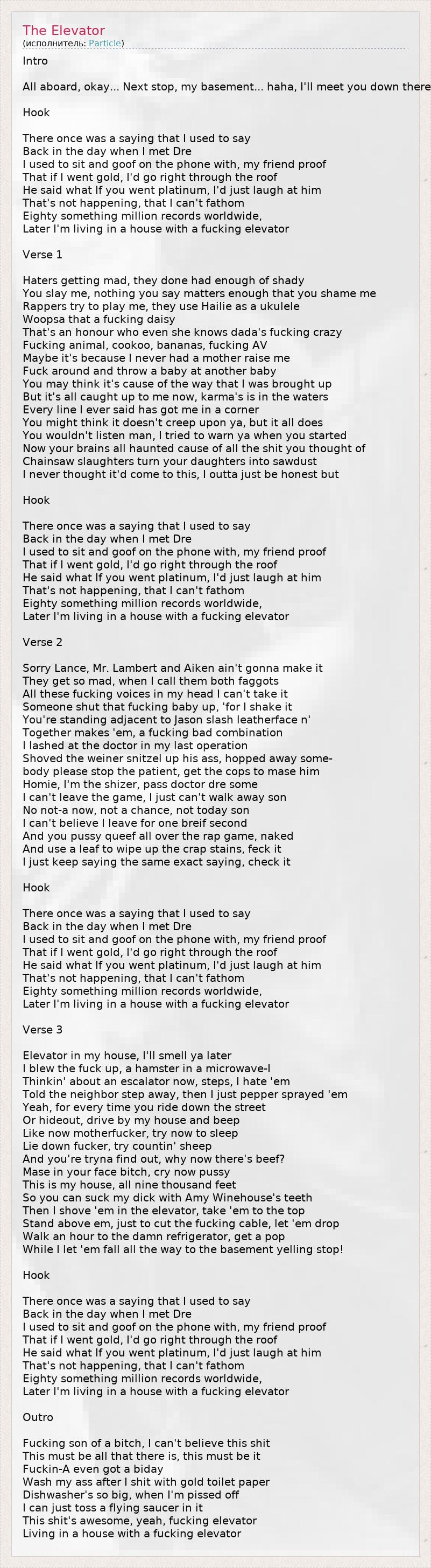 Intro All aboard, okay... Next stop, my basement... haha, I'll meet you down there Hook There once was a saying that I used to say Back in the day when I met Dre I used to sit and goof on the phone with, my friend proof That if I went gold, I'd go right through the roof He said what If you went platinum, I'd just laugh at him That's not happening, that I can't fathom Eighty something million records worldwide, Later I'm living in a house with a fucking elevator Verse 1 Haters getting mad, they done had enough of shady You slay me, nothing you say matters enough that you shame me Rappers try to play me, they use Hailie as a ukulele Woopsa that a fucking daisy That's an honour who even she knows dada's fucking crazy Fucking animal, cookoo, bananas, fucking AV Maybe it's because I never had a mother raise me Fuck around and throw a baby at another baby You may think it's cause of the way that I was brought up But it's all caught up to me now, karma's is in the waters Every line I ever said has got me in a corner You might think it doesn't creep upon ya, but it all does You wouldn't listen man, I tried to warn ya when you started Now your brains all haunted cause of all the shit you thought of Chainsaw slaughters turn your daughters into sawdust I never thought it'd come to this, I outta just be honest but Hook There once was a saying that I used to say Back in the day when I met Dre I used to sit and goof on the phone with, my friend proof That if I went gold, I'd go right through the roof He said what If you went platinum, I'd just laugh at him That's not happening, that I can't fathom Eighty something million records worldwide, Later I'm living in a house with a fucking elevator Verse 2 Sorry Lance, Mr. Lambert and Aiken ain't gonna make it They get so mad, when I call them both faggots All these fucking voices in my head I can't take it Someone shut that fucking baby up, 'for I shake it You're standing adjacent to Jason slash leatherface n' Together makes 'em, a fucking bad combination I lashed at the doctor in my last operation Shoved the weiner snitzel up his ass, hopped away some- body please stop the patient, get the cops to mase him Homie, I'm the shizer, pass doctor dre some I can't leave the game, I just can't walk away son No not-a now, not a chance, not today son I can't believe I leave for one breif second And you pussy queef all over the rap game, naked And use a leaf to wipe up the crap stains, feck it I just keep saying the same exact saying, check it Hook There once was a saying that I used to say Back in the day when I met Dre I used to sit and goof on the phone with, my friend proof That if I went gold, I'd go right through the roof He said what If you went platinum, I'd just laugh at him That's not happening, that I can't fathom Eighty something million records worldwide, Later I'm living in a house with a fucking elevator Verse 3 Elevator in my house, I'll smell ya later I blew the fuck up, a hamster in a microwave-I Thinkin' about an escalator now, steps, I hate 'em Told the neighbor step away, then I just pepper sprayed 'em Yeah, for every time you ride down the street Or hideout, drive by my house and beep Like now motherfucker, try now to sleep Lie down fucker, try countin' sheep And you're tryna find out, why now there's beef? Mase in your face bitch, cry now pussy This is my house, all nine thousand feet So you can suck my dick with Amy Winehouse's teeth Then I shove 'em in the elevator, take 'em to the top Stand above em, just to cut the fucking cable, let 'em drop Walk an hour to the damn refrigerator, get a pop While I let 'em fall all the way to the basement yelling stop! Hook There once was a saying that I used to say Back in the day when I met Dre I used to sit and goof on the phone with, my friend proof That if I went gold, I'd go right through the roof He said what If you went platinum, I'd just laugh at him That's not happening, that I can't fathom Eighty something million records worldwide, Later I'm living in a house with a fucking elevator Outro Fucking son of a bitch, I can't believe this shit This must be all that there is, this must be it Fuckin-A even got a biday Wash my ass after I shit with gold toilet paper Dishwasher's so big, when I'm pissed off I can just toss a flying saucer in it This shit's awesome, yeah, fucking elevator Living in a house with a fucking elevator