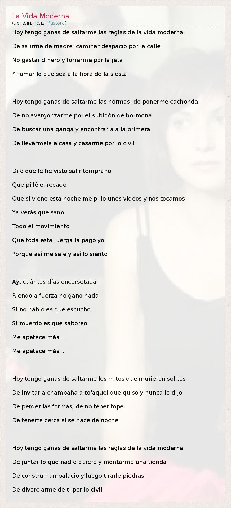 Hoy tengo ganas de saltarme las reglas de la vida moderna De salirme de madre, caminar despacio por la calle No gastar dinero y forrarme por la jeta Y fumar lo que sea a la hora de la siesta Hoy tengo ganas de saltarme las normas, de ponerme cachonda De no avergonzarme por el subidón de hormona De buscar una ganga y encontrarla a la primera De llevármela a casa y casarme por lo civil Dile que le he visto salir temprano Que pillé el recado Que si viene esta noche me pillo unos vídeos y nos tocamos Ya verás que sano Todo el movimiento Que toda esta juerga la pago yo Porque así me sale y así lo siento Ay, cuántos días encorsetada Riendo a fuerza no gano nada Si no hablo es que escucho Si muerdo es que saboreo Me apetece más... Me apetece más... Hoy tengo ganas de saltarme los mitos que murieron solitos De invitar a champaña a to'aquél que quiso y nunca lo dijo De perder las formas, de no tener tope De tenerte cerca si se hace de noche Hoy tengo ganas de saltarme las reglas de la vida moderna De juntar lo que nadie quiere y montarme una tienda De construir un palacio y luego tirarle piedras De divorciarme de ti por lo civil