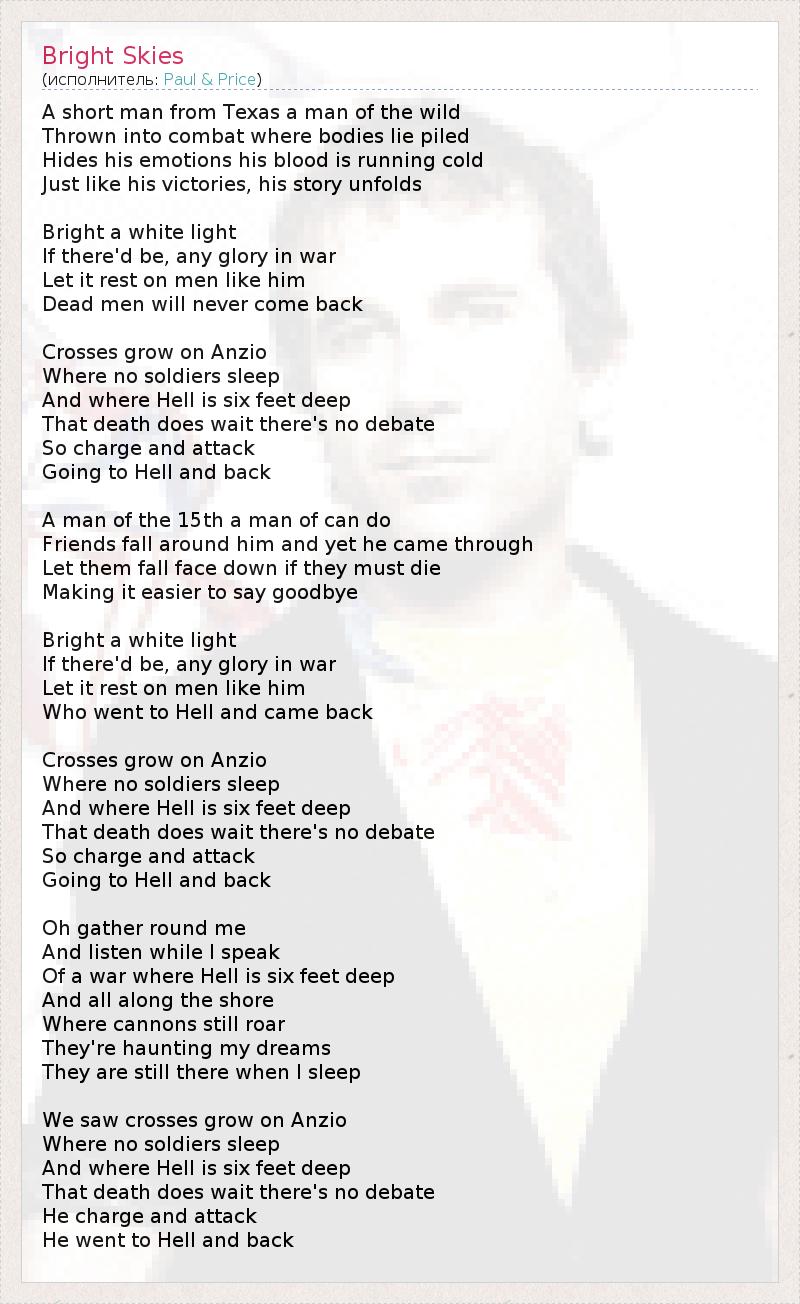 * песня посвящена американскому военному Оди Мерфи; "В ад и обратно" - автобиографическая книга, написанная им в 1949 году (также экранизированная). Припев позаимствован из одноимённого стихотворения.