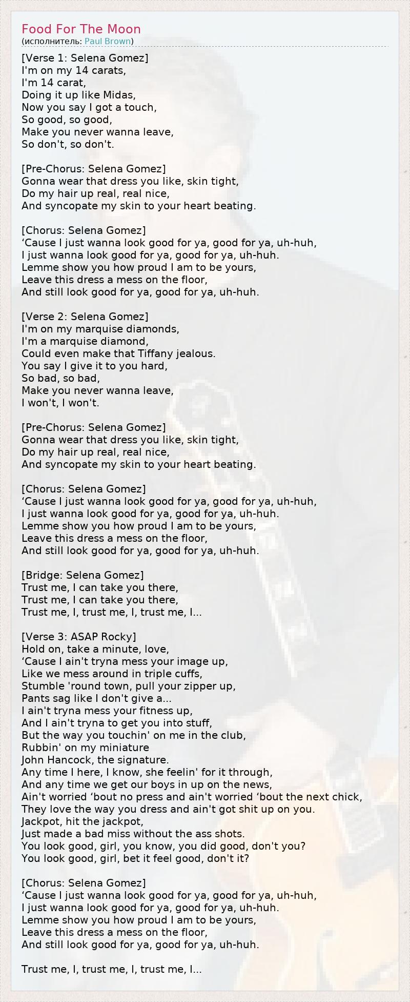 [Verse 1: Selena Gomez] I'm on my 14 carats, I'm 14 carat, Doing it up like Midas, Now you say I got a touch, So good, so good, Make you never wanna leave, So don't, so don't. [Pre-Chorus: Selena Gomez] Gonna wear that dress you like, skin tight, Do my hair up real, real nice, And syncopate my skin to your heart beating. [Chorus: Selena Gomez] ‘Cause I just wanna look good for ya, good for ya, uh-huh, I just wanna look good for ya, good for ya, uh-huh. Lemme show you how proud I am to be yours, Leave this dress a mess on the floor, And still look good for ya, good for ya, uh-huh. [Verse 2: Selena Gomez] I'm on my marquise diamonds, I'm a marquise diamond, Could even make that Tiffany jealous. You say I give it to you hard, So bad, so bad, Make you never wanna leave, I won't, I won't. [Pre-Chorus: Selena Gomez] Gonna wear that dress you like, skin tight, Do my hair up real, real nice, And syncopate my skin to your heart beating. [Chorus: Selena Gomez] ‘Cause I just wanna look good for ya, good for ya, uh-huh, I just wanna look good for ya, good for ya, uh-huh. Lemme show you how proud I am to be yours, Leave this dress a mess on the floor, And still look good for ya, good for ya, uh-huh. [Bridge: Selena Gomez] Trust me, I can take you there, Trust me, I can take you there, Trust me, I, trust me, I, trust me, I... [Verse 3: ASAP Rocky] Hold on, take a minute, love, ‘Cause I ain't tryna mess your image up, Like we mess around in triple cuffs, Stumble 'round town, pull your zipper up, Pants sag like I don't give a... I ain't tryna mess your fitness up, And I ain't tryna to get you into stuff, But the way you touchin' on me in the club, Rubbin' on my miniature John Hancock, the signature. Any time I here, I know, she feelin' for it through, And any time we get our boys in up on the news, Ain't worried ‘bout no press and ain't worried ‘bout the next chick, They love the way you dress and ain't got shit up on you. Jackpot, hit the jackpot, Just made a bad miss without the ass shots. You look good, girl, you know, you did good, don't you? You look good, girl, bet it feel good, don't it? [Chorus: Selena Gomez] ‘Cause I just wanna look good for ya, good for ya, uh-huh, I just wanna look good for ya, good for ya, uh-huh. Lemme show you how proud I am to be yours, Leave this dress a mess on the floor, And still look good for ya, good for ya, uh-huh. Trust me, I, trust me, I, trust me, I...