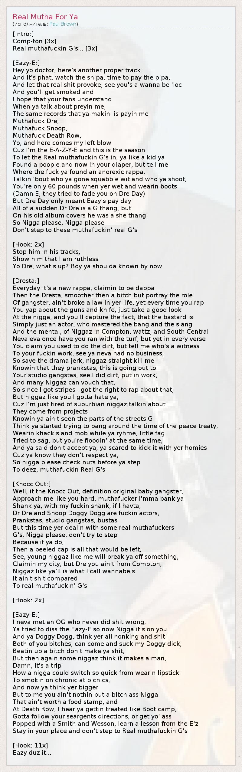 [Интро:] Комп-тон [3x] Настоящие, мать их, гангстеры... [3x] [Eazy-E:] Эй, доктор, вот еще один правильный трек, И он крут, остерегайся снайперов! Пора платить по счетам, И пусть этот трек спровоцирует, ведь ты просто подражатель, Иди обкурись! Надеюсь, твои фанаты понимают, Что когда ты говоришь, что охотишься на меня, Теми самыми записями ты делаешь меня богаче, Нах Dre, Нах Snoop, Нах лейбл Death Row, И тут отхвати слева, Потому что я И-З-И-И и это время, Когда настоящие греб*нные гангстеры в деле, А ты похож на дитя, которое нашло какашку у себя в подгузнике, И расскажи мне, откуда ты, бл*, взял этого анорексичного рэпера? Рассказывает, с кем он разбирается и кого он подстрелил, А сам-то весит 30 килограмм, и то, когда мокрый и в ботинках (Черт, и они пытаются тебя убрать в День Dre) Да, День Dre - на самом деле это День платить Eazy, И вдруг он оказывается "Просто Гангстер", А на старых обложках дисков он почему-то выглядит как "Просто тёлка", Так что ниг*ер, пожалуйста... ниг*ер, пожалуйста, Не связывайся с этими... с настоящими мать их гангстерами [Hook: 2x] Поставлю его на место в его же треках И покажу ему, что я беспощаден, Эй, Дрэ, чё как? Парень, тебе пора бы знать... [Dresta:] Каждый день новый рэпер заявляет, что ловче, Чем Dresta, нежнее чем с*чка, но зато изображает роль Гангстера, никогда в жизни не нарушал закон, и все время, когда читает рэп, Рассказывает о пушках и ножах. Приглядись хорошенько К этому ниг*еру, и ты поймешь, что на самом деле убл*док - Просто актер, который отработал поведение, разговор И психологию ниг*еров из Камптона, Уотса и Южного Централа. Никогда не видел, чтобы убегали с пылью из-под пят, но в каждой cтроке Заявляешь, что раньше занимался грязными делишками, но расскажи, кто свидетель Твоей греб*нной работы? У тебя никогда не было серьезных дел, Продолжай рассказывать сказки, м*дак! Ты прямо убиваешь меня своим позерством! Ты же гангстер только на студии, а я делаю грязь и всегда реально занят, И многие ниг*еры подтвердят это. Если я жестил, то я и читаю об этом, Но ниг*еров, таких как ты, нужно ненавидеть. Уже устал от провинциальных ниг*еров, которые пи*дят, Что они с центра, Я знаю, что ты не видел даже часть уличной жести, Кажется, ты затесался в братву в период перемирия. Носишь хаки и читаешь рэп на тусовках, Мелкий п*дик, пытаешься зависнуть, но много пиз*ишь, Не согласен с этим? Просто боишься это принять, Знаешь, что твои дружки тебя не уважают, Так что, ниг*ер, убедись, что кишка не тонка, прежде чем связываться С настоящими, мать их, гангстерами [Knocc Out:] Короче, это Knocc Out, ты определенно настоящий гангста, Обращайся ко мне, как будто ты жёсткий убл*док, Я тебя закопаю после того, как отпинаю, Dr Dre и Snoop Doggy Dogg, *банные актеры, Позеры, студийные гангстеры, неудачники, Но теперь пора разобраться вам с настоящими ребятами, Гангстерами, ниг*ер, пожалуйста, не надо с нами связываться, Потому что если ты все-таки сделаешь это, То козырек кепки - все, что от тебя останется, Молодые ниг*еры, как я, сломают тебе что-нибудь, Ты орешь про мой город, но, Dre, ты не из Комптона, Ниг*еров, как ты, я называю "Хотящие быть кем-то", И вас даже нельзя сравнивать с настоящими, мать их, Гангстерами, как мы [Hook: 2x] [Eazy-E:] Я никогда не встречал настоящего гангстера, который бы делал все по правилам. Ты пытался нахамить Eazy-E, а теперь это про тебя И про твоего Doggy Dogg'a, вы просто блевотина и дер*мо, Вы обе, с*чки, можете приехать и 