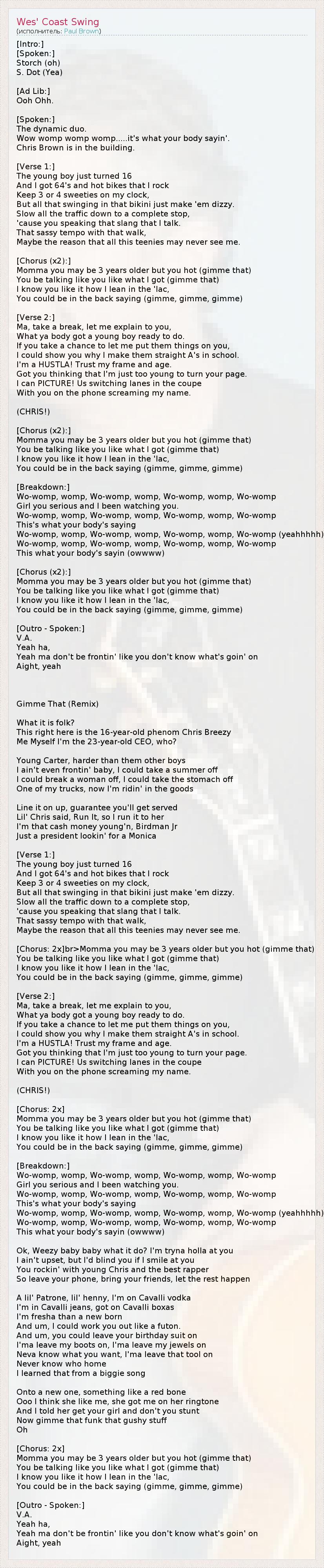 [Intro:] [Spoken:] Storch (oh) S. Dot (Yea) [Ad Lib:] Ooh Ohh. [Spoken:] The dynamic duo. Wow womp womp womp.....it's what your body sayin'. Chris Brown is in the building. [Verse 1:] The young boy just turned 16 And I got 64's and hot bikes that I rock Keep 3 or 4 sweeties on my clock, But all that swinging in that bikini just make 'em dizzy. Slow all the traffic down to a complete stop, 'cause you speaking that slang that I talk. That sassy tempo with that walk, Maybe the reason that all this teenies may never see me. [Chorus (x2):] Momma you may be 3 years older but you hot (gimme that) You be talking like you like what I got (gimme that) I know you like it how I lean in the 'lac, You could be in the back saying (gimme, gimme, gimme) [Verse 2:] Ma, take a break, let me explain to you, What ya body got a young boy ready to do. If you take a chance to let me put them things on you, I could show you why I make them straight A's in school. I'm a HUSTLA! Trust my frame and age. Got you thinking that I'm just too young to turn your page. I can PICTURE! Us switching lanes in the coupe With you on the phone screaming my name. (CHRIS!) [Chorus (x2):] Momma you may be 3 years older but you hot (gimme that) You be talking like you like what I got (gimme that) I know you like it how I lean in the 'lac, You could be in the back saying (gimme, gimme, gimme) [Breakdown:] Wo-womp, womp, Wo-womp, womp, Wo-womp, womp, Wo-womp Girl you serious and I been watching you. Wo-womp, womp, Wo-womp, womp, Wo-womp, womp, Wo-womp This's what your body's saying Wo-womp, womp, Wo-womp, womp, Wo-womp, womp, Wo-womp (yeahhhhh) Wo-womp, womp, Wo-womp, womp, Wo-womp, womp, Wo-womp This what your body's sayin (owwww) [Chorus (x2):] Momma you may be 3 years older but you hot (gimme that) You be talking like you like what I got (gimme that) I know you like it how I lean in the 'lac, You could be in the back saying (gimme, gimme, gimme) [Outro - Spoken:] V.A. Yeah ha, Yeah ma don't be frontin' like you don't know what's goin' on Aight, yeah Gimme That (Remix) What it is folk? This right here is the 16-year-old phenom Chris Breezy Me Myself I'm the 23-year-old CEO, who? Young Carter, harder than them other boys I ain't even frontin' baby, I could take a summer off I could break a woman off, I could take the stomach off One of my trucks, now I'm ridin' in the goods Line it on up, guarantee you'll get served Lil' Chris said, Run It, so I run it to her I'm that cash money young'n, Birdman Jr Just a president lookin' for a Monica [Verse 1:] The young boy just turned 16 And I got 64's and hot bikes that I rock Keep 3 or 4 sweeties on my clock, But all that swinging in that bikini just make 'em dizzy. Slow all the traffic down to a complete stop, 'cause you speaking that slang that I talk. That sassy tempo with that walk, Maybe the reason that all this teenies may never see me. [Chorus: 2x]br>Momma you may be 3 years older but you hot (gimme that) You be talking like you like what I got (gimme that) I know you like it how I lean in the 'lac, You could be in the back saying (gimme, gimme, gimme) [Verse 2:] Ma, take a break, let me explain to you, What ya body got a young boy ready to do. If you take a chance to let me put them things on you, I could show you why I make them straight A's in school. I'm a HUSTLA! Trust my frame and age. Got you thinking that I'm just too young to turn your page. I can PICTURE! Us switching lanes in the coupe With you on the phone screaming my name. (CHRIS!) [Chorus: 2x] Momma you may be 3 years older but you hot (gimme that) You be talking like you like what I got (gimme that) I know you like it how I lean in the 'lac, You could be in the back saying (gimme, gimme, gimme) [Breakdown:] Wo-womp, womp, Wo-womp, womp, Wo-womp, womp, Wo-womp Girl you serious and I been watching you. Wo-womp, womp, Wo-womp, womp, Wo-womp, womp, Wo-womp This's what your body's saying Wo-womp, womp, Wo-womp, womp, Wo-womp, womp, Wo-womp (yeahhhhh) Wo-womp, womp, Wo-womp, womp, Wo-womp, womp, Wo-womp This what your body's sayin (owwww) Ok, Weezy baby baby what it do? I'm tryna holla at you I ain't upset, but I'd blind you if I smile at you You rockin' with young Chris and the best rapper So leave your phone, bring your friends, let the rest happen A lil' Patrone, lil' henny, I'm on Cavalli vodka I'm in Cavalli jeans, got on Cavalli boxas I'm fresha than a new born And um, I could work you out like a futon. And um, you could leave your birthday suit on I'ma leave my boots on, I'ma leave my jewels on Neva know what you want, I'ma leave that tool on Never know who home I learned that from a biggie song Onto a new one, something like a red bone Ooo I think she like me, she got me on her ringtone And I told her get your girl and don't you stunt Now gimme that funk that gushy stuff Oh [Chorus: 2x] Momma you may be 3 years older but you hot (gimme that) You be talking like you like what I got (gimme that) I know you like it how I lean in the 'lac, You could be in the back saying (gimme, gimme, gimme) [Outro - Spoken:] V.A. Yeah ha, Yeah ma don't be frontin' like you don't know what's goin' on Aight, yeah