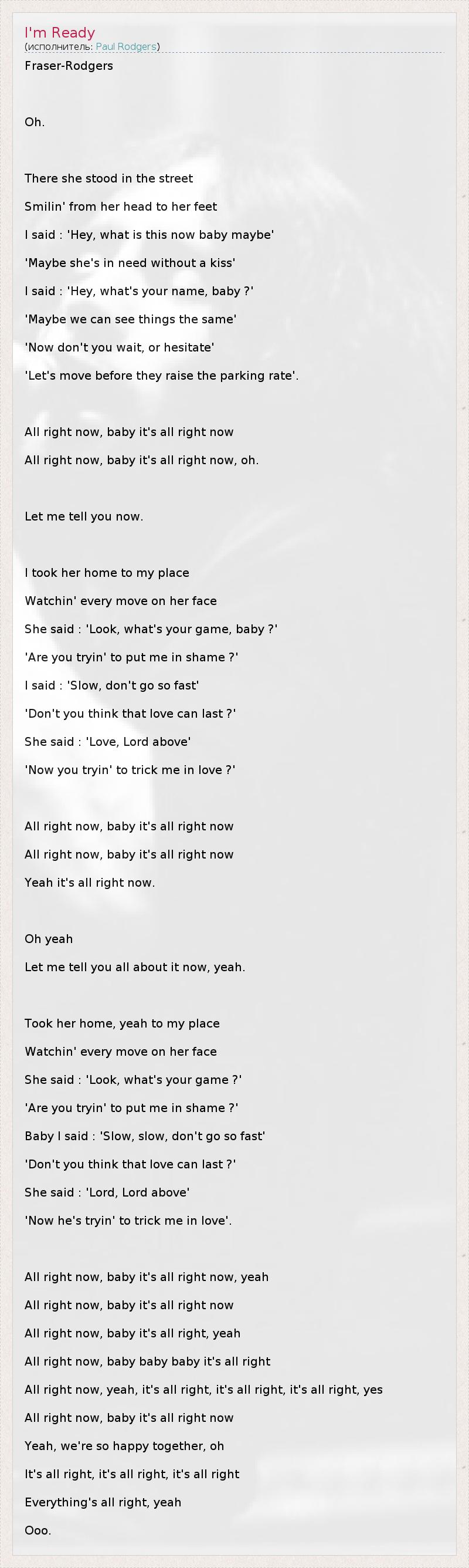 Fraser-Rodgers Oh. There she stood in the street Smilin' from her head to her feet I said : 'Hey, what is this now baby maybe' 'Maybe she's in need without a kiss' I said : 'Hey, what's your name, baby ?' 'Maybe we can see things the same' 'Now don't you wait, or hesitate' 'Let's move before they raise the parking rate'. All right now, baby it's all right now All right now, baby it's all right now, oh. Let me tell you now. I took her home to my place Watchin' every move on her face She said : 'Look, what's your game, baby ?' 'Are you tryin' to put me in shame ?' I said : 'Slow, don't go so fast' 'Don't you think that love can last ?' She said : 'Love, Lord above' 'Now you tryin' to trick me in love ?' All right now, baby it's all right now All right now, baby it's all right now Yeah it's all right now. Oh yeah Let me tell you all about it now, yeah. Took her home, yeah to my place Watchin' every move on her face She said : 'Look, what's your game ?' 'Are you tryin' to put me in shame ?' Baby I said : 'Slow, slow, don't go so fast' 'Don't you think that love can last ?' She said : 'Lord, Lord above' 'Now he's tryin' to trick me in love'. All right now, baby it's all right now, yeah All right now, baby it's all right now All right now, baby it's all right, yeah All right now, baby baby baby it's all right All right now, yeah, it's all right, it's all right, it's all right, yes All right now, baby it's all right now Yeah, we're so happy together, oh It's all right, it's all right, it's all right Everything's all right, yeah Ooo.