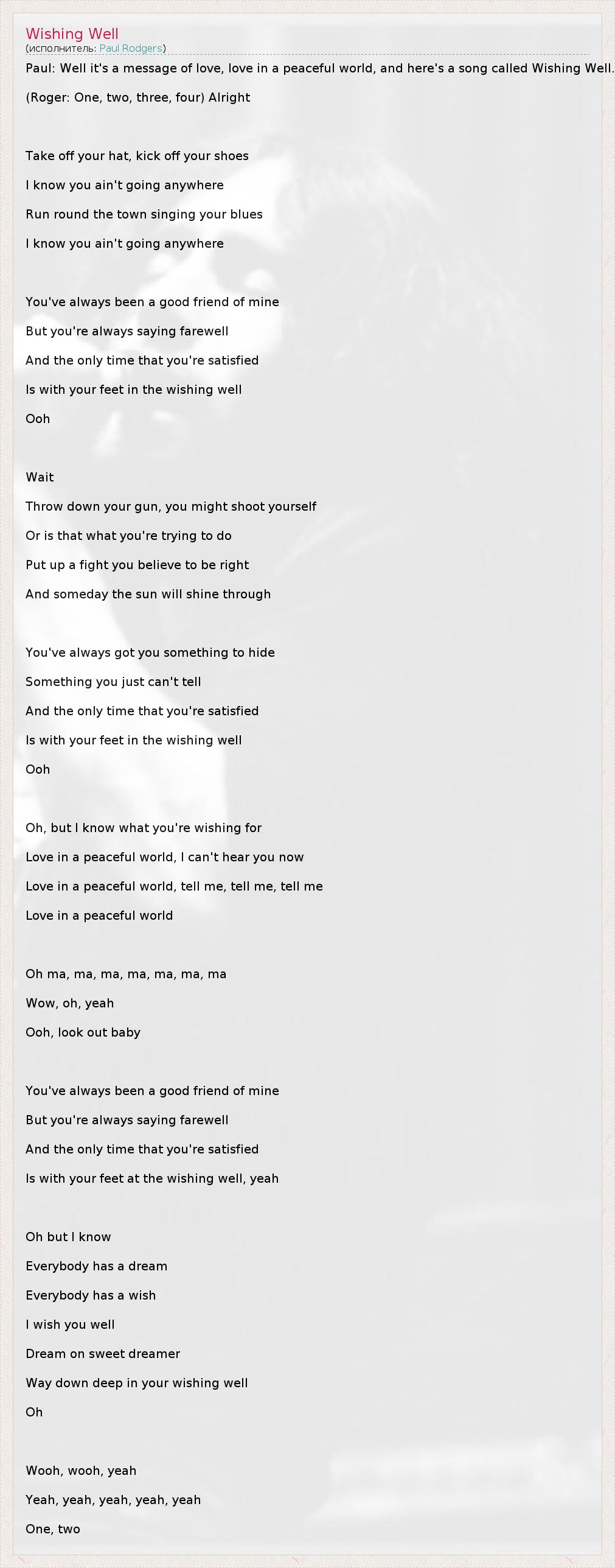 Paul: Well it's a message of love, love in a peaceful world, and here's a song called Wishing Well. (Roger: One, two, three, four) Alright Take off your hat, kick off your shoes I know you ain't going anywhere Run round the town singing your blues I know you ain't going anywhere You've always been a good friend of mine But you're always saying farewell And the only time that you're satisfied Is with your feet in the wishing well Ooh Wait Throw down your gun, you might shoot yourself Or is that what you're trying to do Put up a fight you believe to be right And someday the sun will shine through You've always got you something to hide Something you just can't tell And the only time that you're satisfied Is with your feet in the wishing well Ooh Oh, but I know what you're wishing for Love in a peaceful world, I can't hear you now Love in a peaceful world, tell me, tell me, tell me Love in a peaceful world Oh ma, ma, ma, ma, ma, ma, ma Wow, oh, yeah Ooh, look out baby You've always been a good friend of mine But you're always saying farewell And the only time that you're satisfied Is with your feet at the wishing well, yeah Oh but I know Everybody has a dream Everybody has a wish I wish you well Dream on sweet dreamer Way down deep in your wishing well Oh Wooh, wooh, yeah Yeah, yeah, yeah, yeah, yeah One, two