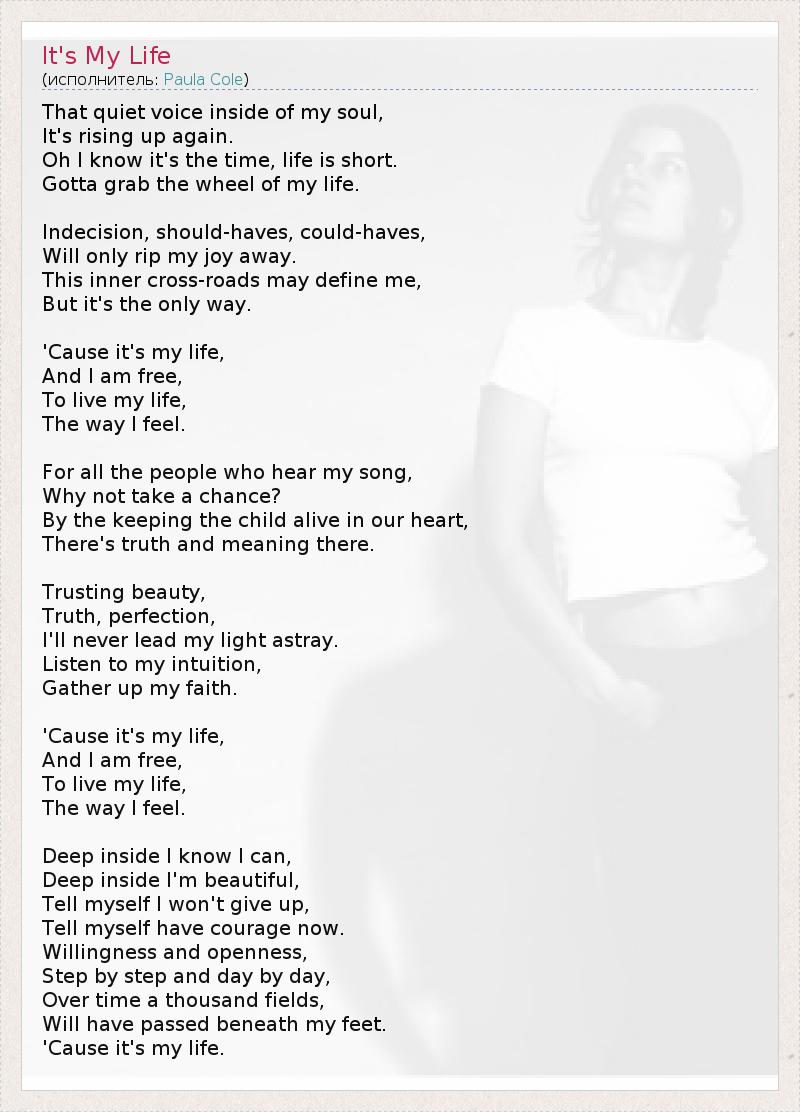 That quiet voice inside of my soul, It's rising up again. Oh I know it's the time, life is short. Gotta grab the wheel of my life. Indecision, should-haves, could-haves, Will only rip my joy away. This inner cross-roads may define me, But it's the only way. 'Cause it's my life, And I am free, To live my life, The way I feel. For all the people who hear my song, Why not take a chance? By the keeping the child alive in our heart, There's truth and meaning there. Trusting beauty, Truth, perfection, I'll never lead my light astray. Listen to my intuition, Gather up my faith. 'Cause it's my life, And I am free, To live my life, The way I feel. Deep inside I know I can, Deep inside I'm beautiful, Tell myself I won't give up, Tell myself have courage now. Willingness and openness, Step by step and day by day, Over time a thousand fields, Will have passed beneath my feet. 'Cause it's my life.