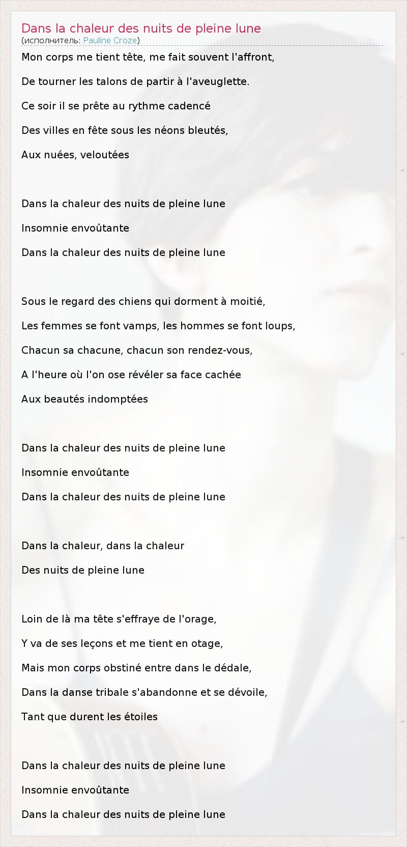 А как ты думаешь, о чем песня "Dans la chaleur des nuits de pleine lune" ?