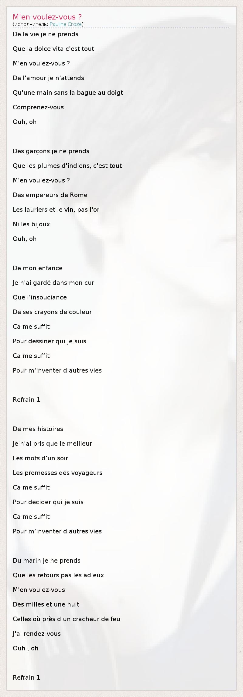 De la vie je ne prends Que la dolce vita c'est tout M'en voulez-vous ? De l'amour je n'attends Qu'une main sans la bague au doigt Comprenez-vous Ouh, oh Des garçons je ne prends Que les plumes d'indiens, c'est tout M'en voulez-vous ? Des empereurs de Rome Les lauriers et le vin, pas l'or Ni les bijoux Ouh, oh De mon enfance Je n'ai gardé dans mon cur Que l'insouciance De ses crayons de couleur Ca me suffit Pour dessiner qui je suis Ca me suffit Pour m'inventer d'autres vies Refrain 1 De mes histoires Je n'ai pris que le meilleur Les mots d'un soir Les promesses des voyageurs Ca me suffit Pour decider qui je suis Ca me suffit Pour m'inventer d'autres vies Du marin je ne prends Que les retours pas les adieux M'en voulez-vous Des milles et une nuit Celles où près d'un cracheur de feu J'ai rendez-vous Ouh , oh Refrain 1