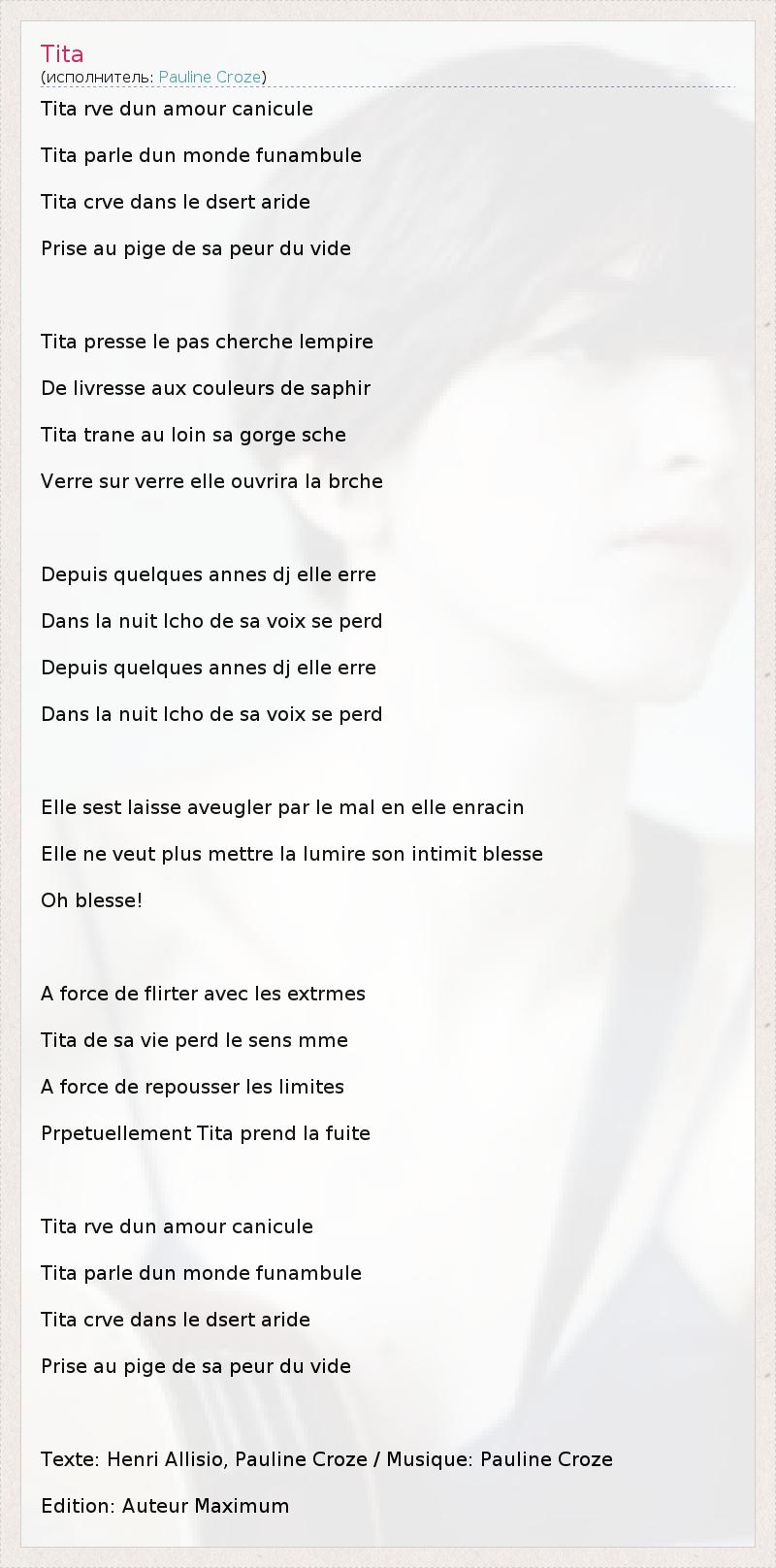 Tita rve dun amour canicule Tita parle dun monde funambule Tita crve dans le dsert aride Prise au pige de sa peur du vide Tita presse le pas cherche lempire De livresse aux couleurs de saphir Tita trane au loin sa gorge sche Verre sur verre elle ouvrira la brche Depuis quelques annes dj elle erre Dans la nuit lcho de sa voix se perd Depuis quelques annes dj elle erre Dans la nuit lcho de sa voix se perd Elle sest laisse aveugler par le mal en elle enracin Elle ne veut plus mettre la lumire son intimit blesse Oh blesse! A force de flirter avec les extrmes Tita de sa vie perd le sens mme A force de repousser les limites Prpetuellement Tita prend la fuite Tita rve dun amour canicule Tita parle dun monde funambule Tita crve dans le dsert aride Prise au pige de sa peur du vide Texte: Henri Allisio, Pauline Croze / Musique: Pauline Croze Edition: Auteur Maximum
