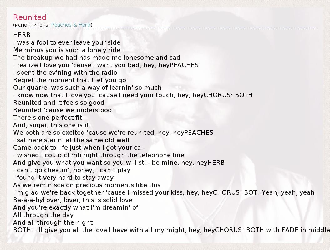 HERB I was a fool to ever leave your side Me minus you is such a lonely ride The breakup we had has made me lonesome and sad I realize I love you 'cause I want you bad, hey, heyPEACHES I spent the ev'ning with the radio Regret the moment that I let you go Our quarrel was such a way of learnin' so much I know now that I love you 'cause I need your touch, hey, heyCHORUS: BOTH Reunited and it feels so good Reunited 'cause we understood There's one perfect fit And, sugar, this one is it We both are so excited 'cause we're reunited, hey, heyPEACHES I sat here starin' at the same old wall Came back to life just when I got your call I wished I could climb right through the telephone line And give you what you want so you will still be mine, hey, heyHERB I can't go cheatin', honey, I can't play I found it very hard to stay away As we reminisce on precious moments like this I'm glad we're back together 'cause I missed your kiss, hey, heyCHORUS: BOTHYeah, yeah, yeah Ba-a-a-byLover, lover, this is solid love And you're exactly what I'm dreamin' of All through the day And all through the night BOTH: I'll give you all the love I have with all my might, hey, heyCHORUS: BOTH with FADE in middle
