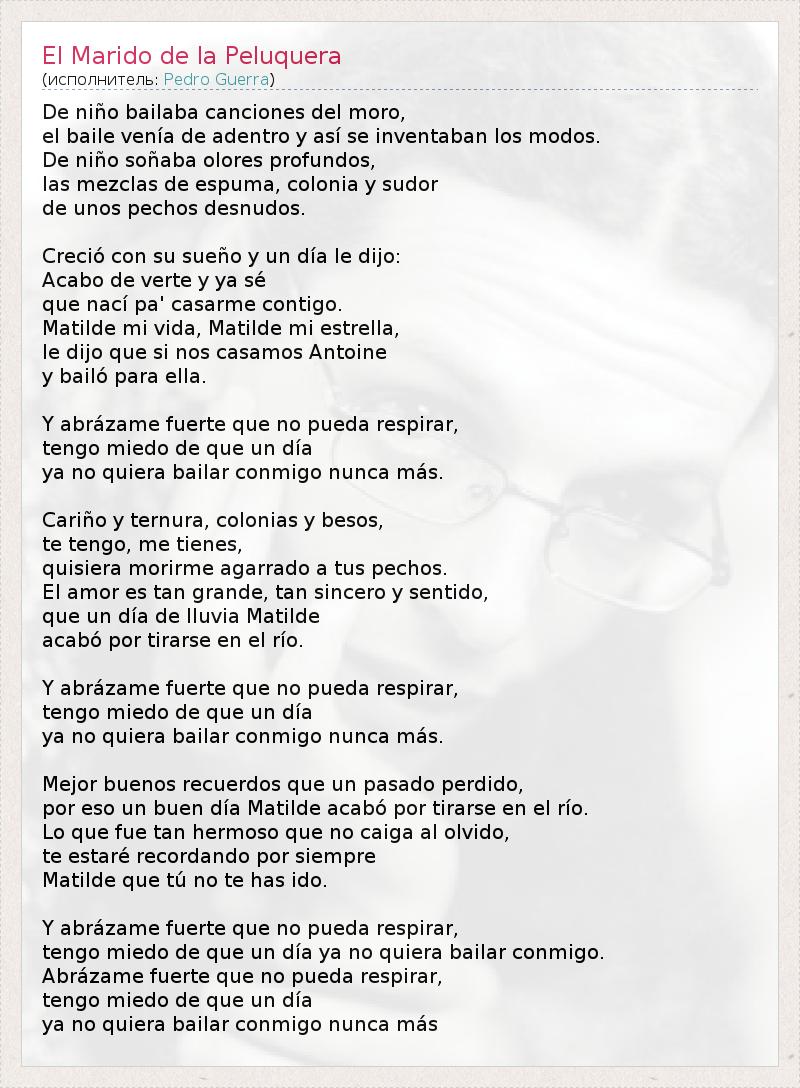 De-Ниньо bailaba Canciones-дель-Моро, эль Бейл Веня-де-адентро у así себе inventaban лос modos. De-Ниньо soñaba olores profundos, лас mezclas де Espuma, Колония у Sudor де-ОСОО pechos desnudos. Creció кон су sueño у ООН día ле dijo: Acabo де Верт у Я. sé Que Naci годовых "casarme Солидарность. Матильда ми вида, Матильда миль Estrella, ле dijo Que си NOS casamos Антуан у Bailo пункт Элла. не Y abrázame Fuerte Que не pueda respirar, Тенго Miedo де Que ООН día я не quiera Bailar Conmigo Nunca más. Cariño у ternura, Colonias у Бесос TE Тенго, я TIENES, quisiera morirme agarrado ЕП pechos. El Amor эс загар Гранде, загар Sincero у Sentido, Que ООН Диа-де-Lluvia Матильда acabó POR tirarse En El Rio. не Y abrázame Fuerte Que не pueda respirar, Тенго Miedo де Que ООН día я не quiera Bailar Conmigo Nunca más. Mejor Буэнос Recuerdos Que ООН Pasado Пердидо, Пор ESO ООН Буэн día Матильда acabó POR tirarse En El Rio. не Lo Que ФРУ загар Эрмосо Que не caiga аль olvido, TE estaré recordando POR Siempre Матильда Que tú No Te не имеет IDO. не Y abrázame Fuerte Que не pueda respirar, Тенго Miedo де Que ООН día я не quiera Bailar Conmigo. Abrázame Fuerte Que не pueda respirar, Тенго Miedo де Que ООН día не я не quiera Bailar Conmigo Nunca más