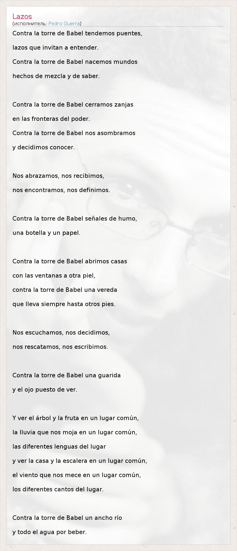 Contra la torre de Babel tendemos puentes, lazos que invitan a entender. Contra la torre de Babel nacemos mundos hechos de mezcla y de saber. Contra la torre de Babel cerramos zanjas en las fronteras del poder. Contra la torre de Babel nos asombramos y decidimos conocer. Nos abrazamos, nos recibimos, nos encontramos, nos definimos. Contra la torre de Babel señales de humo, una botella y un papel. Contra la torre de Babel abrimos casas con las ventanas a otra piel, contra la torre de Babel una vereda que lleva siempre hasta otros pies. Nos escuchamos, nos decidimos, nos rescatamos, nos escribimos. Contra la torre de Babel una guarida y el ojo puesto de ver. Y ver el árbol y la fruta en un lugar común, la lluvia que nos moja en un lugar común, las diferentes lenguas del lugar y ver la casa y la escalera en un lugar común, el viento que nos mece en un lugar común, los diferentes cantos del lugar. Contra la torre de Babel un ancho río y todo el agua por beber.