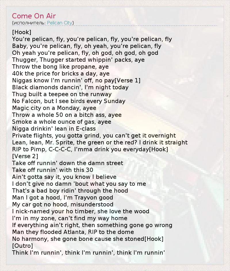 You're pelican, fly, you're pelican, fly, you're pelican, fly
