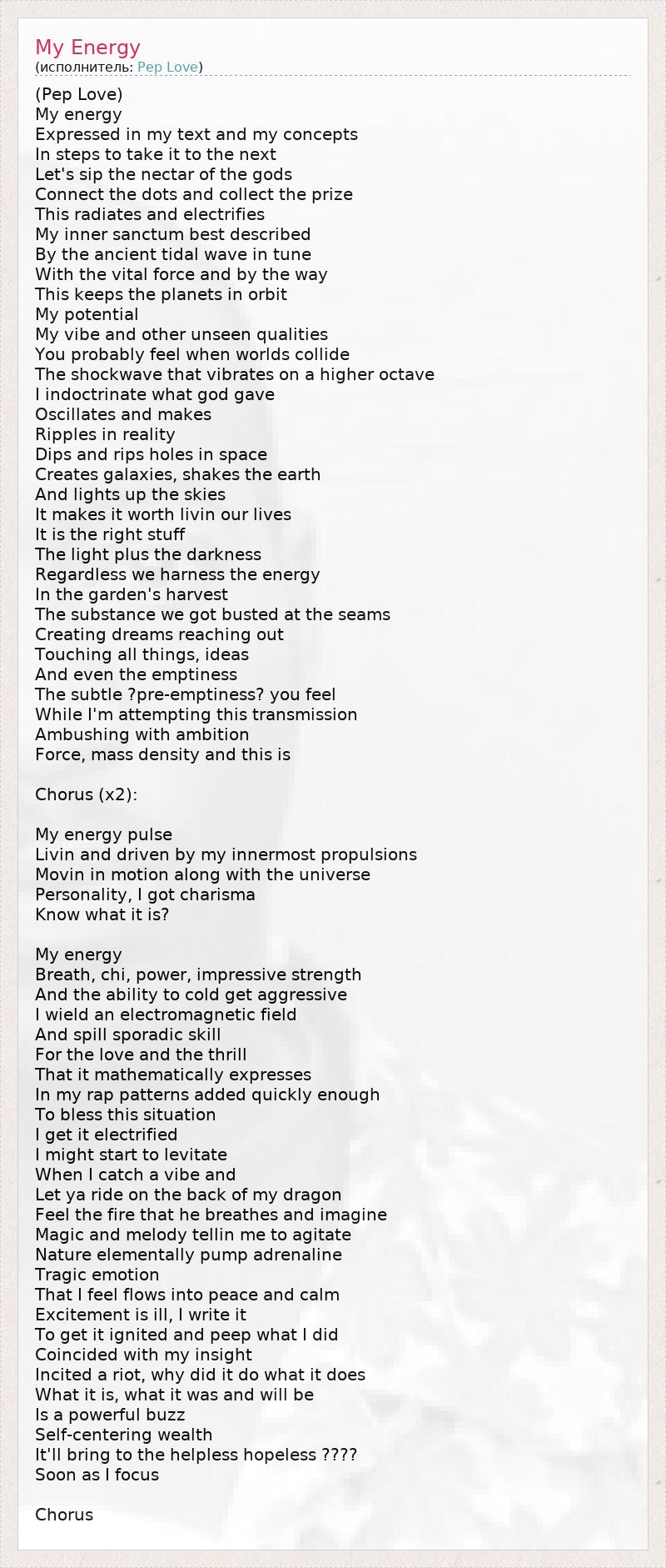 (Pep Love) My energy Expressed in my text and my concepts In steps to take it to the next Let's sip the nectar of the gods Connect the dots and collect the prize This radiates and electrifies My inner sanctum best described By the ancient tidal wave in tune With the vital force and by the way This keeps the planets in orbit My potential My vibe and other unseen qualities You probably feel when worlds collide The shockwave that vibrates on a higher octave I indoctrinate what god gave Oscillates and makes Ripples in reality Dips and rips holes in space Creates galaxies, shakes the earth And lights up the skies It makes it worth livin our lives It is the right stuff The light plus the darkness Regardless we harness the energy In the garden's harvest The substance we got busted at the seams Creating dreams reaching out Touching all things, ideas And even the emptiness The subtle ?pre-emptiness? you feel While I'm attempting this transmission Ambushing with ambition Force, mass density and this is Chorus (x2): My energy pulse Livin and driven by my innermost propulsions Movin in motion along with the universe Personality, I got charisma Know what it is? My energy Breath, chi, power, impressive strength And the ability to cold get aggressive I wield an electromagnetic field And spill sporadic skill For the love and the thrill That it mathematically expresses In my rap patterns added quickly enough To bless this situation I get it electrified I might start to levitate When I catch a vibe and Let ya ride on the back of my dragon Feel the fire that he breathes and imagine Magic and melody tellin me to agitate Nature elementally pump adrenaline Tragic emotion That I feel flows into peace and calm Excitement is ill, I write it To get it ignited and peep what I did Coincided with my insight Incited a riot, why did it do what it does What it is, what it was and will be Is a powerful buzz Self-centering wealth It'll bring to the helpless hopeless ???? Soon as I focus Chorus