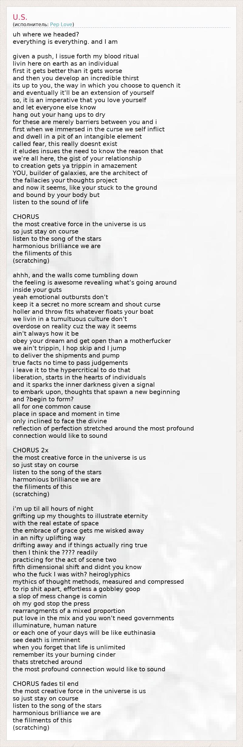 uh where we headed? everything is everything. and I am given a push, I issue forth my blood ritual livin here on earth as an individual first it gets better than it gets worse and then you develop an incredible thirst its up to you, the way in which you choose to quench it and eventually it'll be an extension of yourself so, it is an imperative that you love yourself and let everyone else know hang out your hang ups to dry for these are merely barriers between you and i first when we immersed in the curse we self inflict and dwell in a pit of an intangible element called fear, this really doesnt exist it eludes insues the need to know the reason that we're all here, the gist of your relationship to creation gets ya trippin in amazement YOU, builder of galaxies, are the architect of the fallacies your thoughts project and now it seems, like your stuck to the ground and bound by your body but listen to the sound of life CHORUS the most creative force in the universe is us so just stay on course listen to the song of the stars harmonious brilliance we are the filiments of this (scratching) ahhh, and the walls come tumbling down the feeling is awesome revealing what's going around inside your guts yeah emotional outbursts don't keep it a secret no more scream and shout curse holler and throw fits whatever floats your boat we livin in a tumultuous culture don't overdose on reality cuz the way it seems ain't always how it be obey your dream and get open than a motherfucker we ain't trippin, I hop skip and I jump to deliver the shipments and pump true facts no time to pass judgements i leave it to the hypercritical to do that liberation, starts in the hearts of individuals and it sparks the inner darkness given a signal to embark upon, thoughts that spawn a new beginning and ?begin to form? all for one common cause place in space and moment in time only inclined to face the divine reflection of perfection stretched around the most profound connection would like to sound CHORUS 2x the most creative force in the universe is us so just stay on course listen to the song of the stars harmonious brilliance we are the filiments of this (scratching) i'm up til all hours of night grifting up my thoughts to illustrate eternity with the real estate of space the embrace of grace gets me wisked away in an nifty uplifting way drifting away and if things actually ring true then I think the ???? readily practicing for the act of scene two fifth dimensional shift and didnt you know who the fuck I was with? heiroglyphics mythics of thought methods, measured and compressed to rip shit apart, effortless a gobbley goop a slop of mess change is comin oh my god stop the press rearrangments of a mixed proportion put love in the mix and you won't need governments illuminature, human nature or each one of your days will be like euthinasia see death is imminent when you forget that life is unlimited remember its your burning cinder thats stretched around the most profound connection would like to sound CHORUS fades til end the most creative force in the universe is us so just stay on course listen to the song of the stars harmonious brilliance we are the filiments of this (scratching)
