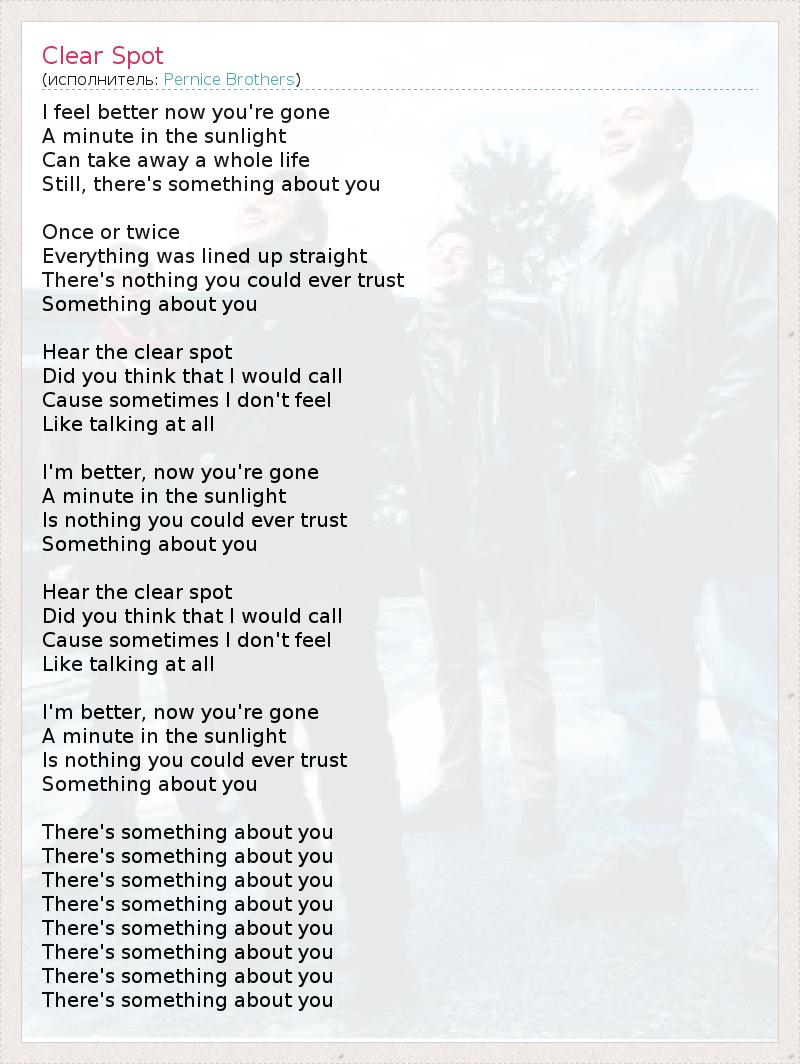 I feel better now you're gone A minute in the sunlight Can take away a whole life Still, there's something about you Once or twice Everything was lined up straight There's nothing you could ever trust Something about you Hear the clear spot Did you think that I would call Cause sometimes I don't feel Like talking at all I'm better, now you're gone A minute in the sunlight Is nothing you could ever trust Something about you Hear the clear spot Did you think that I would call Cause sometimes I don't feel Like talking at all I'm better, now you're gone A minute in the sunlight Is nothing you could ever trust Something about you There's something about you There's something about you There's something about you There's something about you There's something about you There's something about you There's something about you There's something about you