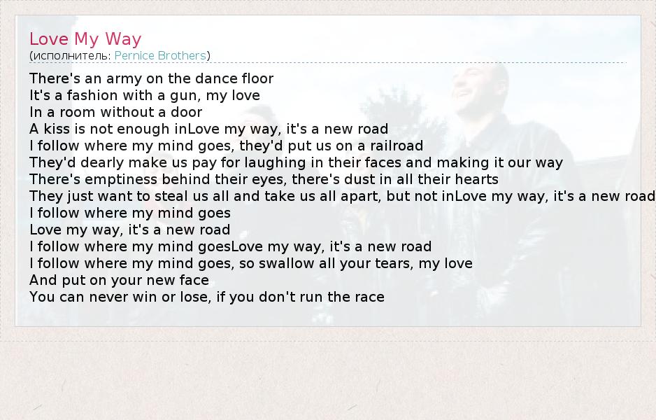 There's an army on the dance floor It's a fashion with a gun, my love In a room without a door A kiss is not enough inLove my way, it's a new road I follow where my mind goes, they'd put us on a railroad They'd dearly make us pay for laughing in their faces and making it our way There's emptiness behind their eyes, there's dust in all their hearts They just want to steal us all and take us all apart, but not inLove my way, it's a new road I follow where my mind goes Love my way, it's a new road I follow where my mind goesLove my way, it's a new road I follow where my mind goes, so swallow all your tears, my love And put on your new face You can never win or lose, if you don't run the race