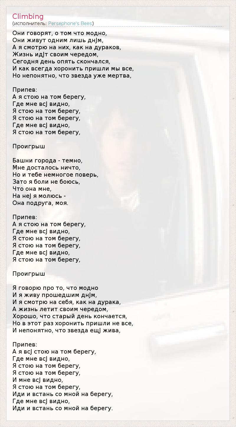 Они говорят, о том что модно, Они живут одним лишь днЈм, А я смотрю на них, как на дураков, Жизнь идЈт своим чередом, Сегодня день опять скончался, И как всегда хоронить пришли мы все, Но непонятно, что звезда уже мертва, Припев: А я стою на том берегу, Где мне всЈ видно, Я стою на том берегу, Я стою на том берегу, Где мне всЈ видно, Я стою на том берегу, Проигрыш Башни города - темно, Мне досталось ничто, Но и тебе немногое поверь, Зато я боли не боюсь, Что она мне, На неЈ я молюсь - Она подруга, моя. Припев: А я стою на том берегу, Где мне всЈ видно, Я стою на том берегу, Я стою на том берегу, Где мне всЈ видно, Я стою на том берегу, Проигрыш Я говорю про то, что модно И я живу прошедшим днЈм, И я смотрю на себя, как на дурака, А жизнь летит своим чередом, Хорошо, что старый день кончается, Но в этот раз хоронить пришли не все, И непонятно, что звезда ещЈ жива, Припев: А я всЈ стою на том берегу, Где мне всЈ видно, Я стою на том берегу, Я стою на том берегу, И мне всЈ видно, Я стою на том берегу, Иди и встань со мной на берегу, Где мне всЈ видно, Иди и встань со мной на берегу.
