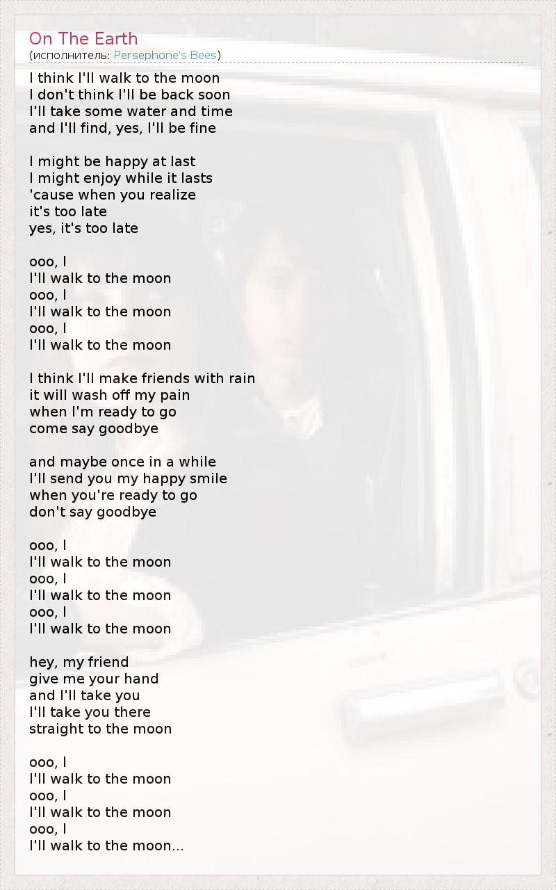 I think I'll walk to the moon I don't think I'll be back soon I'll take some water and time and I'll find, yes, I'll be fine I might be happy at last I might enjoy while it lasts 'cause when you realize it's too late yes, it's too late ooo, I I'll walk to the moon ooo, I I'll walk to the moon ooo, I I'll walk to the moon I think I'll make friends with rain it will wash off my pain when I'm ready to go come say goodbye and maybe once in a while I'll send you my happy smile when you're ready to go don't say goodbye ooo, I I'll walk to the moon ooo, I I'll walk to the moon ooo, I I'll walk to the moon hey, my friend give me your hand and I'll take you I'll take you there straight to the moon ooo, I I'll walk to the moon ooo, I I'll walk to the moon ooo, I I'll walk to the moon...