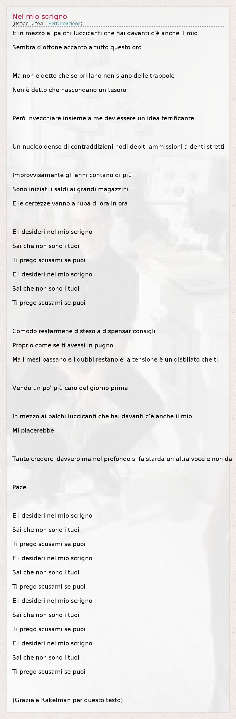 E in mezzo ai palchi luccicanti che hai davanti c'è anche il mio Sembra d'ottone accanto a tutto questo oro Ma non è detto che se brillano non siano delle trappole Non è detto che nascondano un tesoro Però invecchiare insieme a me dev'essere un'idea terrificante Un nucleo denso di contraddizioni nodi debiti ammissioni a denti stretti Improvvisamente gli anni contano di più Sono iniziati i saldi ai grandi magazzini E le certezze vanno a ruba di ora in ora E i desideri nel mio scrigno Sai che non sono i tuoi Ti prego scusami se puoi E i desideri nel mio scrigno Sai che non sono i tuoi Ti prego scusami se puoi Comodo restarmene disteso a dispensar consigli Proprio come se ti avessi in pugno Ma i mesi passano e i dubbi restano e la tensione è un distillato che ti Vendo un po' più caro del giorno prima In mezzo ai palchi luccicanti che hai davanti c'è anche il mio Mi piacerebbe Tanto crederci davvero ma nel profondo si fa starda un'altra voce e non da Pace E i desideri nel mio scrigno Sai che non sono i tuoi Ti prego scusami se puoi E i desideri nel mio scrigno Sai che non sono i tuoi Ti prego scusami se puoi E i desideri nel mio scrigno Sai che non sono i tuoi Ti prego scusami se puoi E i desideri nel mio scrigno Sai che non sono i tuoi Ti prego scusami se puoi (Grazie a Rakelman per questo testo)