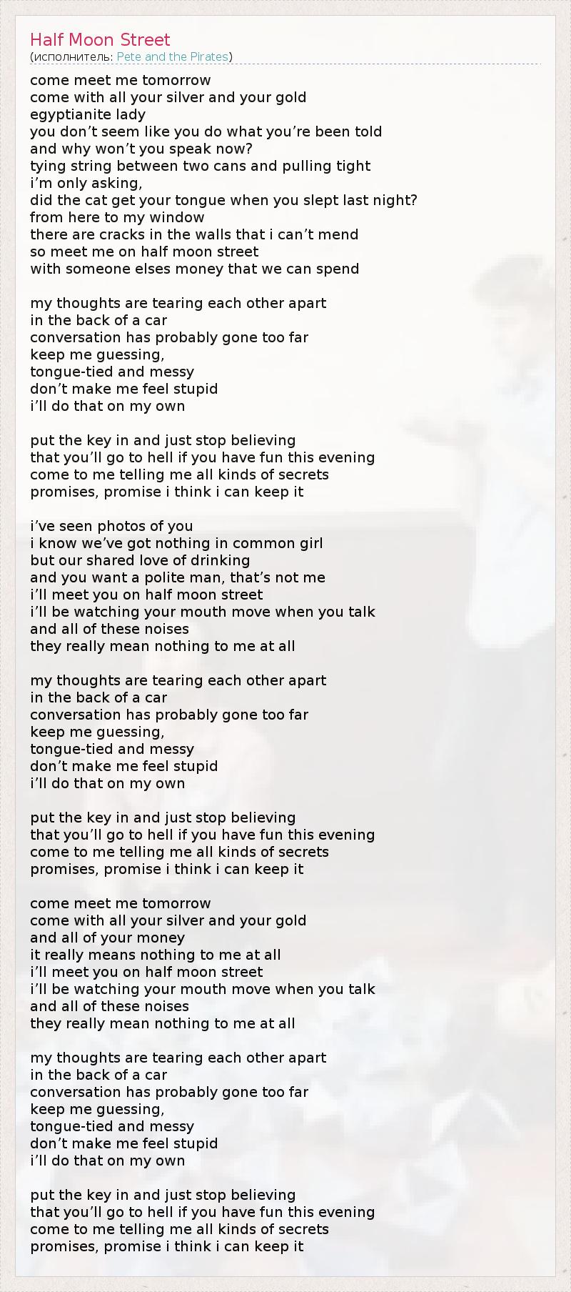 come meet me tomorrow come with all your silver and your gold egyptianite lady you don’t seem like you do what you’re been told and why won’t you speak now? tying string between two cans and pulling tight i’m only asking, did the cat get your tongue when you slept last night? from here to my window there are cracks in the walls that i can’t mend so meet me on half moon street with someone elses money that we can spend my thoughts are tearing each other apart in the back of a car conversation has probably gone too far keep me guessing, tongue-tied and messy don’t make me feel stupid i’ll do that on my own put the key in and just stop believing that you’ll go to hell if you have fun this evening come to me telling me all kinds of secrets promises, promise i think i can keep it i’ve seen photos of you i know we’ve got nothing in common girl but our shared love of drinking and you want a polite man, that’s not me i’ll meet you on half moon street i’ll be watching your mouth move when you talk and all of these noises they really mean nothing to me at all my thoughts are tearing each other apart in the back of a car conversation has probably gone too far keep me guessing, tongue-tied and messy don’t make me feel stupid i’ll do that on my own put the key in and just stop believing that you’ll go to hell if you have fun this evening come to me telling me all kinds of secrets promises, promise i think i can keep it come meet me tomorrow come with all your silver and your gold and all of your money it really means nothing to me at all i’ll meet you on half moon street i’ll be watching your mouth move when you talk and all of these noises they really mean nothing to me at all my thoughts are tearing each other apart in the back of a car conversation has probably gone too far keep me guessing, tongue-tied and messy don’t make me feel stupid i’ll do that on my own put the key in and just stop believing that you’ll go to hell if you have fun this evening come to me telling me all kinds of secrets promises, promise i think i can keep it