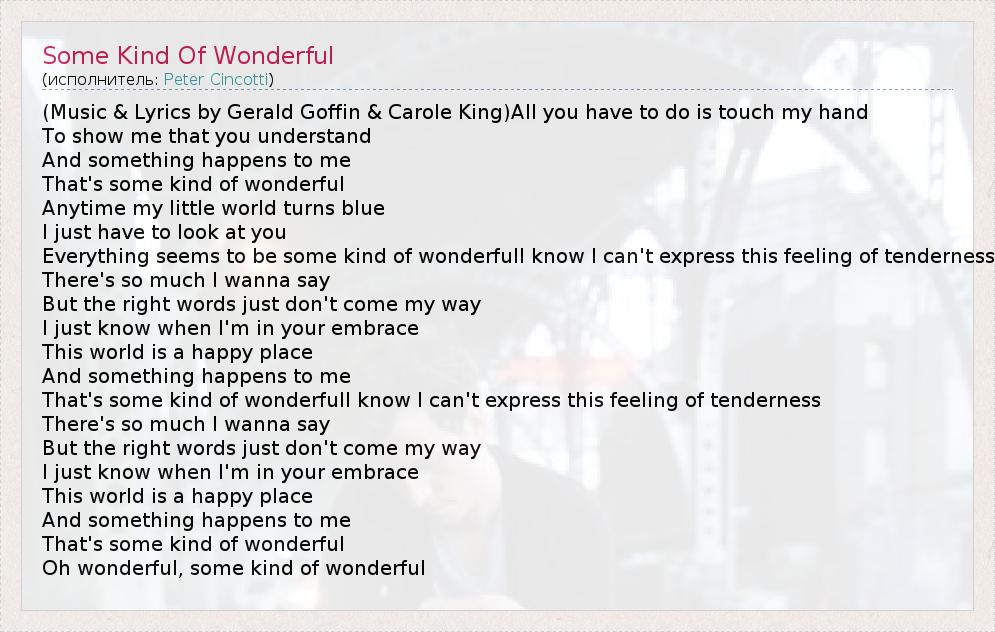 (Music & Lyrics by Gerald Goffin & Carole King)All you have to do is touch my hand To show me that you understand And something happens to me That's some kind of wonderful Anytime my little world turns blue I just have to look at you Everything seems to be some kind of wonderfulI know I can't express this feeling of tenderness There's so much I wanna say But the right words just don't come my way I just know when I'm in your embrace This world is a happy place And something happens to me That's some kind of wonderfulI know I can't express this feeling of tenderness There's so much I wanna say But the right words just don't come my way I just know when I'm in your embrace This world is a happy place And something happens to me That's some kind of wonderful Oh wonderful, some kind of wonderful