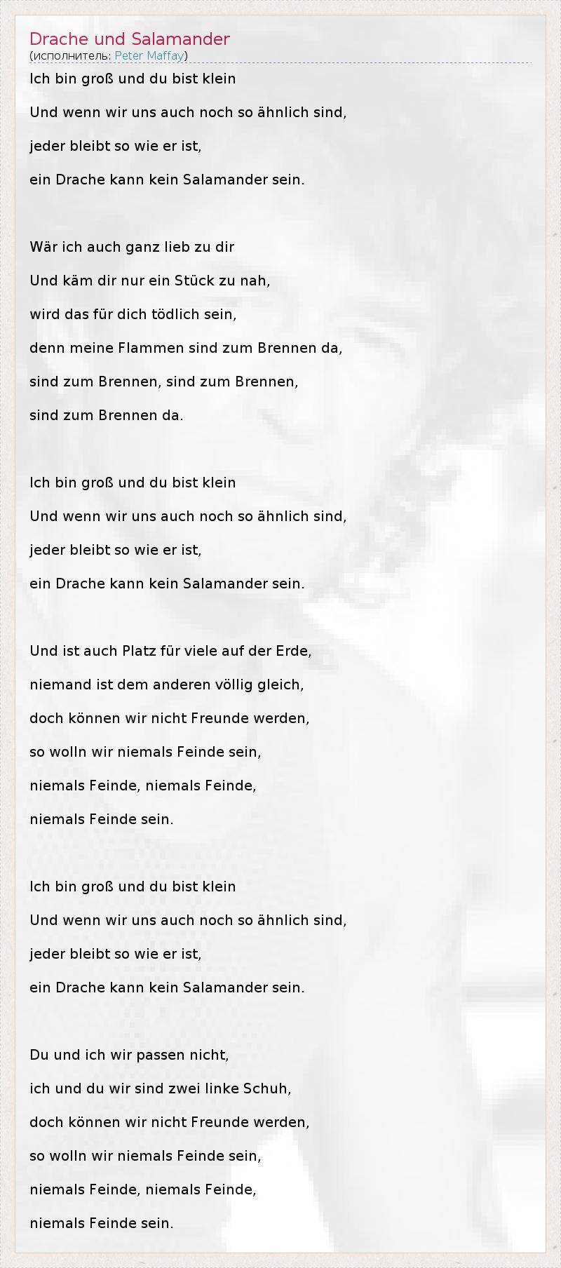 Ich bin groß und du bist klein Und wenn wir uns auch noch so ähnlich sind, jeder bleibt so wie er ist, ein Drache kann kein Salamander sein. Wär ich auch ganz lieb zu dir Und käm dir nur ein Stück zu nah, wird das für dich tödlich sein, denn meine Flammen sind zum Brennen da, sind zum Brennen, sind zum Brennen, sind zum Brennen da. Ich bin groß und du bist klein Und wenn wir uns auch noch so ähnlich sind, jeder bleibt so wie er ist, ein Drache kann kein Salamander sein. Und ist auch Platz für viele auf der Erde, niemand ist dem anderen völlig gleich, doch können wir nicht Freunde werden, so wolln wir niemals Feinde sein, niemals Feinde, niemals Feinde, niemals Feinde sein. Ich bin groß und du bist klein Und wenn wir uns auch noch so ähnlich sind, jeder bleibt so wie er ist, ein Drache kann kein Salamander sein. Du und ich wir passen nicht, ich und du wir sind zwei linke Schuh, doch können wir nicht Freunde werden, so wolln wir niemals Feinde sein, niemals Feinde, niemals Feinde, niemals Feinde sein.