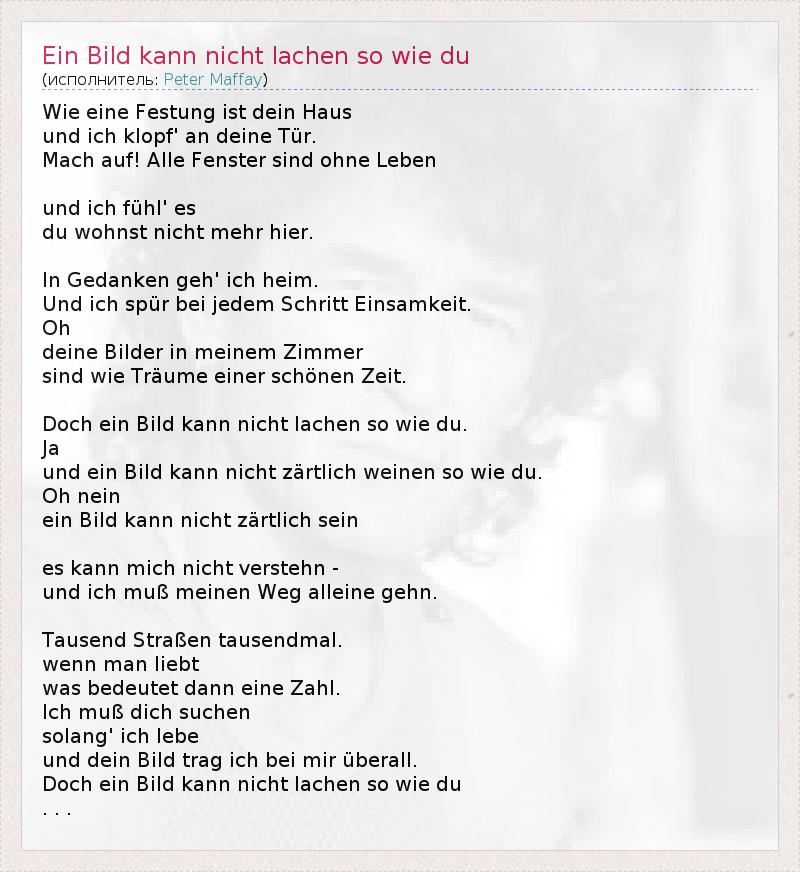 Wie eine Festung ist dein Haus und ich klopf' an deine Tür. Mach auf! Alle Fenster sind ohne Leben und ich fühl' es du wohnst nicht mehr hier. In Gedanken geh' ich heim. Und ich spür bei jedem Schritt Einsamkeit. Oh deine Bilder in meinem Zimmer sind wie Träume einer schönen Zeit. Doch ein Bild kann nicht lachen so wie du. Ja und ein Bild kann nicht zärtlich weinen so wie du. Oh nein ein Bild kann nicht zärtlich sein es kann mich nicht verstehn - und ich muß meinen Weg alleine gehn. Tausend Straßen tausendmal. wenn man liebt was bedeutet dann eine Zahl. Ich muß dich suchen solang' ich lebe und dein Bild trag ich bei mir überall. Doch ein Bild kann nicht lachen so wie du . . .