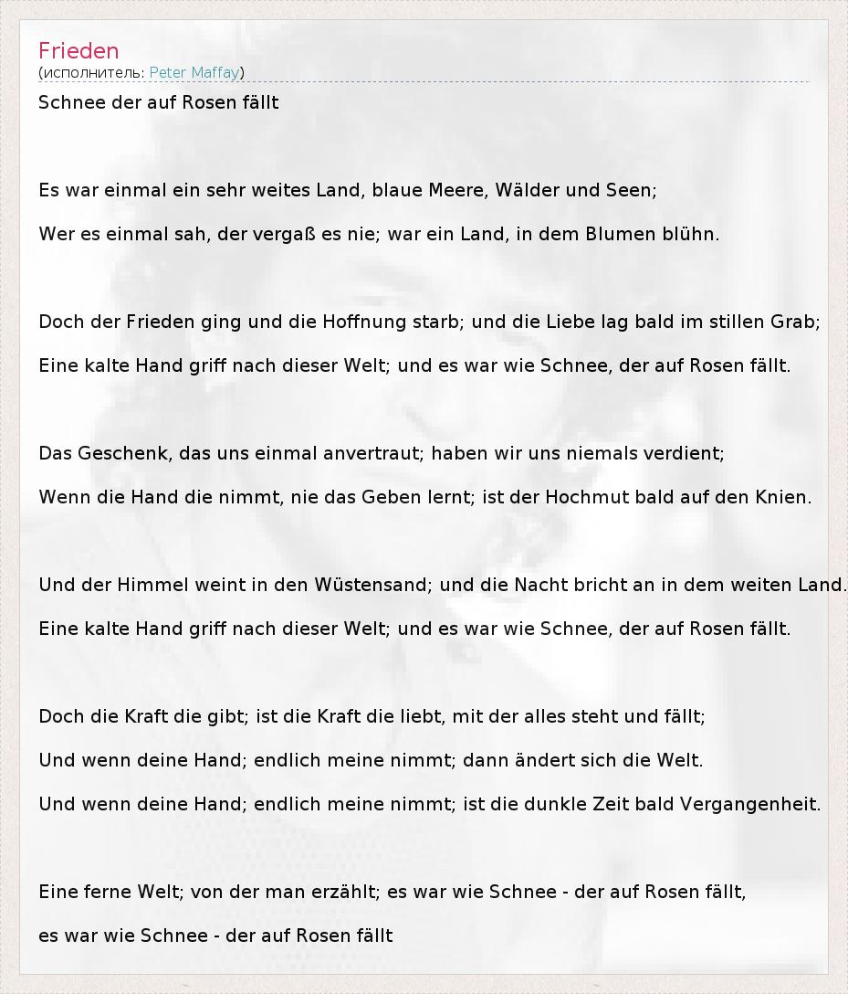 Schnee der auf Rosen fällt Es war einmal ein sehr weites Land, blaue Meere, Wälder und Seen; Wer es einmal sah, der vergaß es nie; war ein Land, in dem Blumen blühn. Doch der Frieden ging und die Hoffnung starb; und die Liebe lag bald im stillen Grab; Eine kalte Hand griff nach dieser Welt; und es war wie Schnee, der auf Rosen fällt. Das Geschenk, das uns einmal anvertraut; haben wir uns niemals verdient; Wenn die Hand die nimmt, nie das Geben lernt; ist der Hochmut bald auf den Knien. Und der Himmel weint in den Wüstensand; und die Nacht bricht an in dem weiten Land. Eine kalte Hand griff nach dieser Welt; und es war wie Schnee, der auf Rosen fällt. Doch die Kraft die gibt; ist die Kraft die liebt, mit der alles steht und fällt; Und wenn deine Hand; endlich meine nimmt; dann ändert sich die Welt. Und wenn deine Hand; endlich meine nimmt; ist die dunkle Zeit bald Vergangenheit. Eine ferne Welt; von der man erzählt; es war wie Schnee - der auf Rosen fällt, es war wie Schnee - der auf Rosen fällt