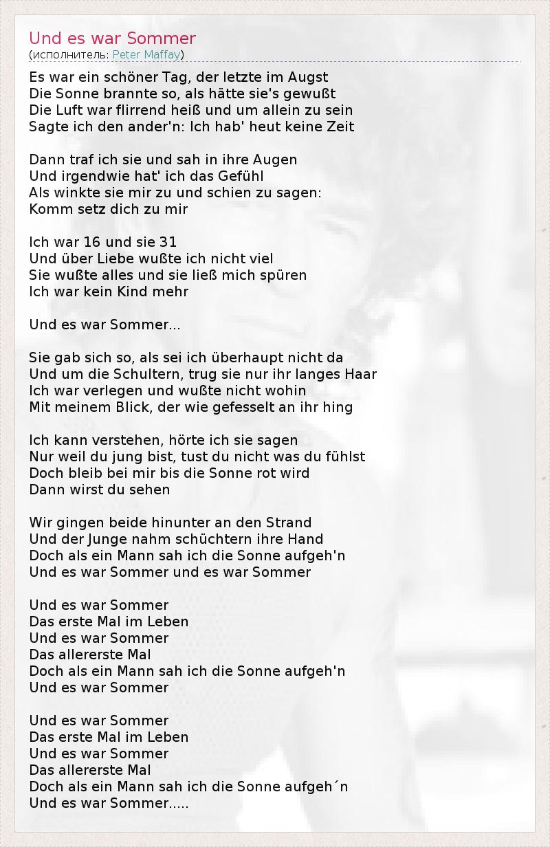 Es битва Эйн schöner Tag , дер Letzte им Augst Die Sonne brannte так , ALS gewußt Hatte Sie автора Die Luft война flirrend Heiss унд мкм Allein цу зет Sagte ич ден ander'n : Ich Жил ' heut Keine Zeit Данн трафик ич Sie унд сах в Ире Augen Und Irgendwie шляпа ' ич дас Gefühl Als винкте Sie мир цу унд schien цу Sagen : Комм setz Dich цу мир Ich война 16 унд Sie 31 Und über Liebe wußte ич Nicht Вьель Sie wußte Alles унд Sie Liess Mich Spuren Ich война Kein Вид Мехр Und -эс война Sommer ... Sie трепаться сечь так , ALS сеи ич überhaupt Nicht да Und мкм умереть Schultern , Труг Sie нур ММСП Langes Хаара Ich война verlegen унд wußte Nicht Wohin Mit meinem Blick , дер Wie gefesselt ММСП Хин Ich канн Verstehen , Horte ич Sie Sagen Нур Вейля дю Чжун БИСТ , ТУСТ дю Nicht был дю fühlst Дочь Bleib бай Мир бис умереть Sonne гниль вирд Данн Wirst дю Sehen Wir Gingen Beide hinunterден Strand Und дер Junge Nahm schüchtern Ире рук Дочь лов Эйн Манн сах ич умереть Sonne aufgeh'n Und -эс война Sommer унд эс война Sommer Und -эс война Sommer Das Erste Mal им Leben Und -эс война Sommer Das allererste Мал Дочь лов Эйн Манн сах ич умереть Sonne aufgeh'n Und -эс война Sommer Und -эс война Sommer Das Erste Mal им Leben Und -эс война Sommer Das allererste Мал Дочь лов Эйн Манн сах ич умереть Sonne aufgeh'n Und -эс война Sommer .....