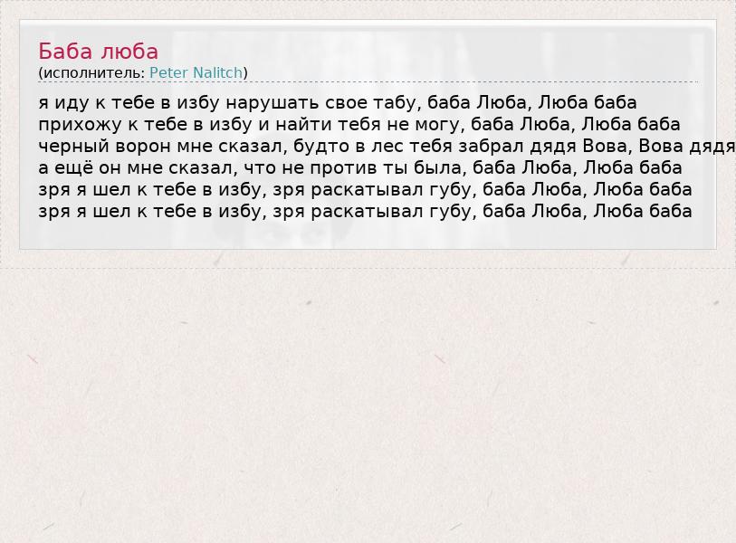 я иду к тебе в избу нарушать свое табу, баба Люба, Люба баба прихожу к тебе в избу и найти тебя не могу, баба Люба, Люба баба черный ворон мне сказал, будто в лес тебя забрал дядя Вова, Вова дядя а ещё он мне сказал, что не против ты была, баба Люба, Люба баба зря я шел к тебе в избу, зря раскатывал губу, баба Люба, Люба баба зря я шел к тебе в избу, зря раскатывал губу, баба Люба, Люба баба