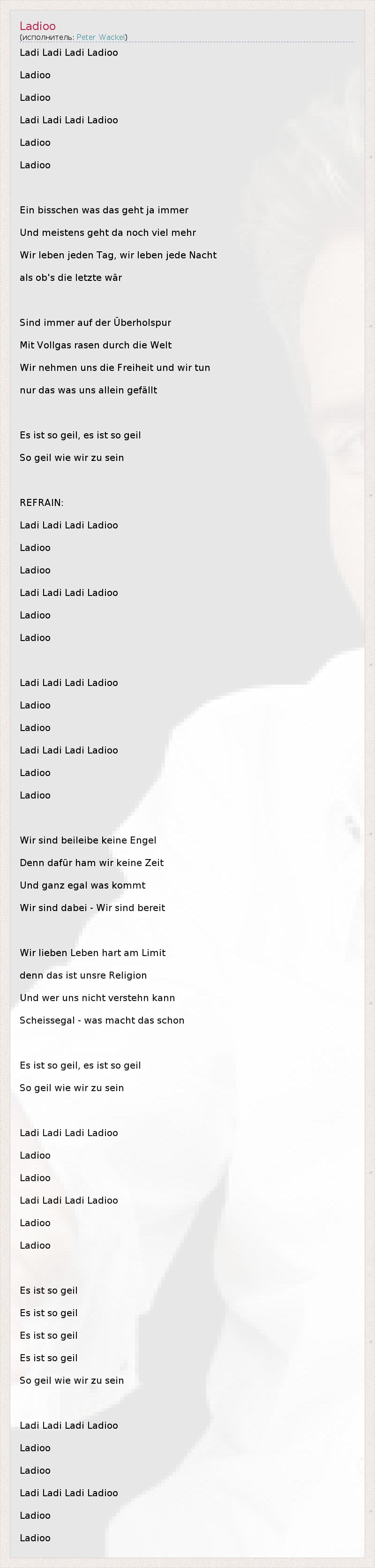 Ladi Ladi Ladi Ladioo Ladioo Ladioo Ladi Ladi Ladi Ladioo Ladioo Ladioo Ein bisschen was das geht ja immer Und meistens geht da noch viel mehr Wir leben jeden Tag, wir leben jede Nacht als ob's die letzte wär Sind immer auf der Überholspur Mit Vollgas rasen durch die Welt Wir nehmen uns die Freiheit und wir tun nur das was uns allein gefällt Es ist so geil, es ist so geil So geil wie wir zu sein REFRAIN: Ladi Ladi Ladi Ladioo Ladioo Ladioo Ladi Ladi Ladi Ladioo Ladioo Ladioo Ladi Ladi Ladi Ladioo Ladioo Ladioo Ladi Ladi Ladi Ladioo Ladioo Ladioo Wir sind beileibe keine Engel Denn dafür ham wir keine Zeit Und ganz egal was kommt Wir sind dabei - Wir sind bereit Wir lieben Leben hart am Limit denn das ist unsre Religion Und wer uns nicht verstehn kann Scheissegal - was macht das schon Es ist so geil, es ist so geil So geil wie wir zu sein Ladi Ladi Ladi Ladioo Ladioo Ladioo Ladi Ladi Ladi Ladioo Ladioo Ladioo Es ist so geil Es ist so geil Es ist so geil Es ist so geil So geil wie wir zu sein Ladi Ladi Ladi Ladioo Ladioo Ladioo Ladi Ladi Ladi Ladioo Ladioo Ladioo